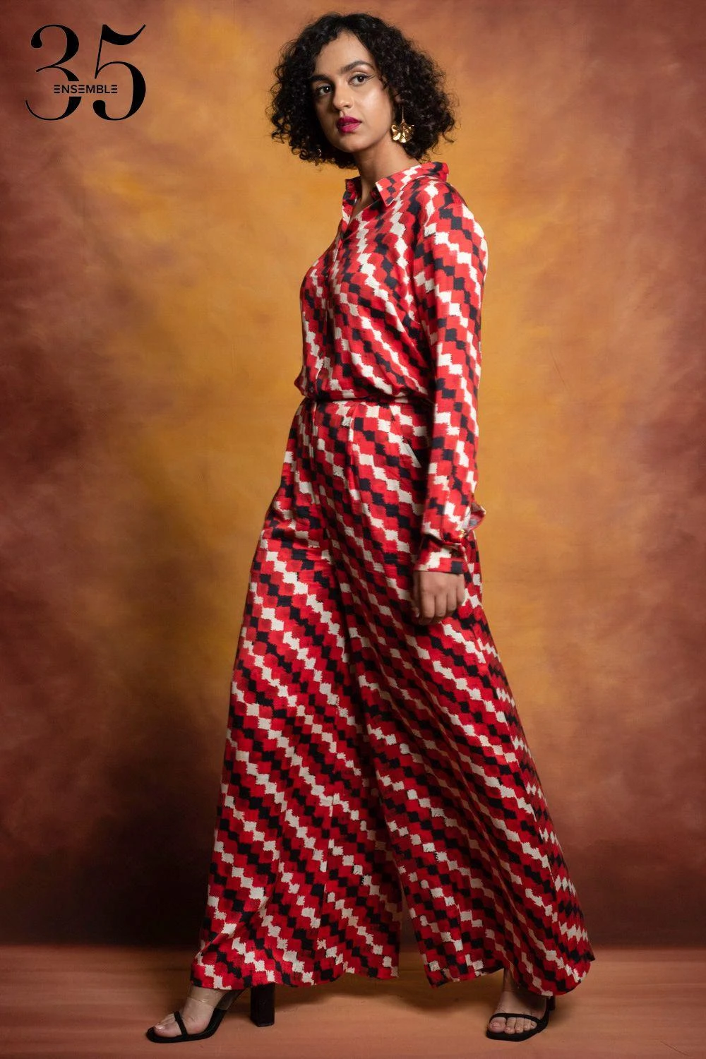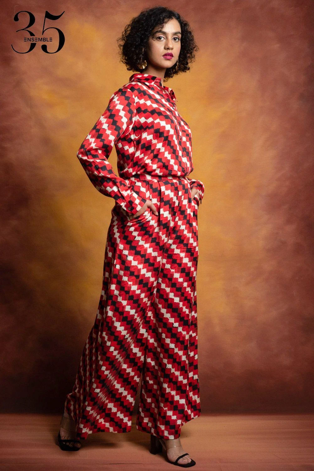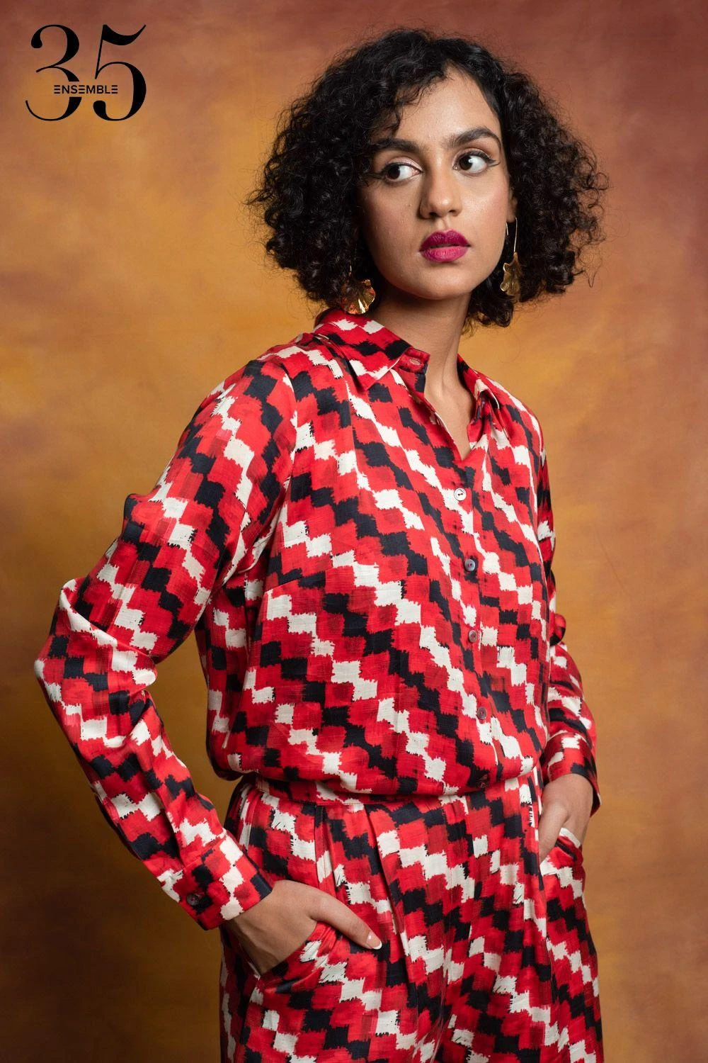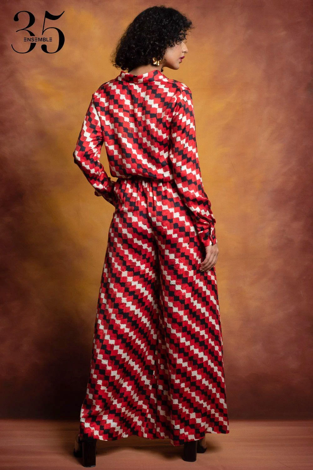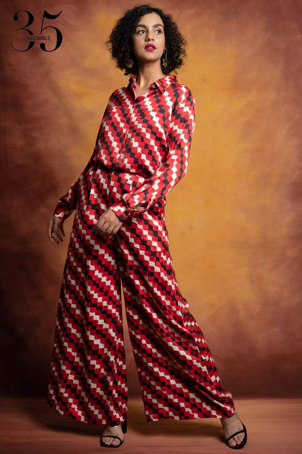 A yearlong celebration of its 35th anniversary telling the story of modern Indian fashion. Crafted in satin, these high-waisted palazzos feature an abstract checkered print. Style it with the red checkered & collared shirt from the collection.