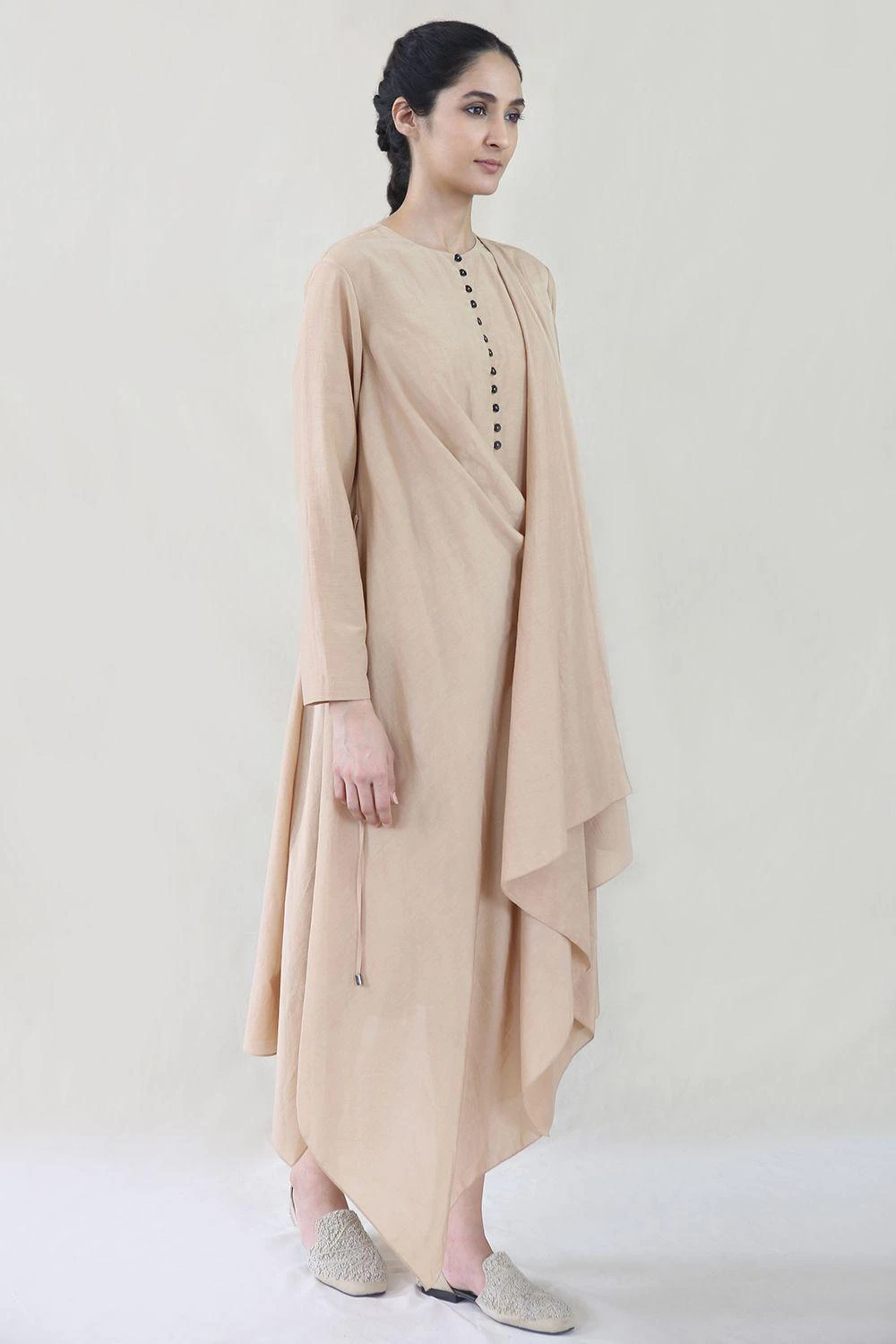 Translating classic angrakha style in this layered asymmetric contemporary shirt, it is an unique piece for its sartorial detailing. Wear it with pumps for your birthday eve.