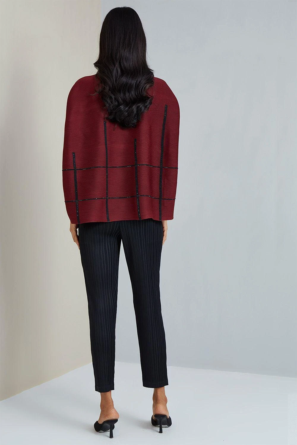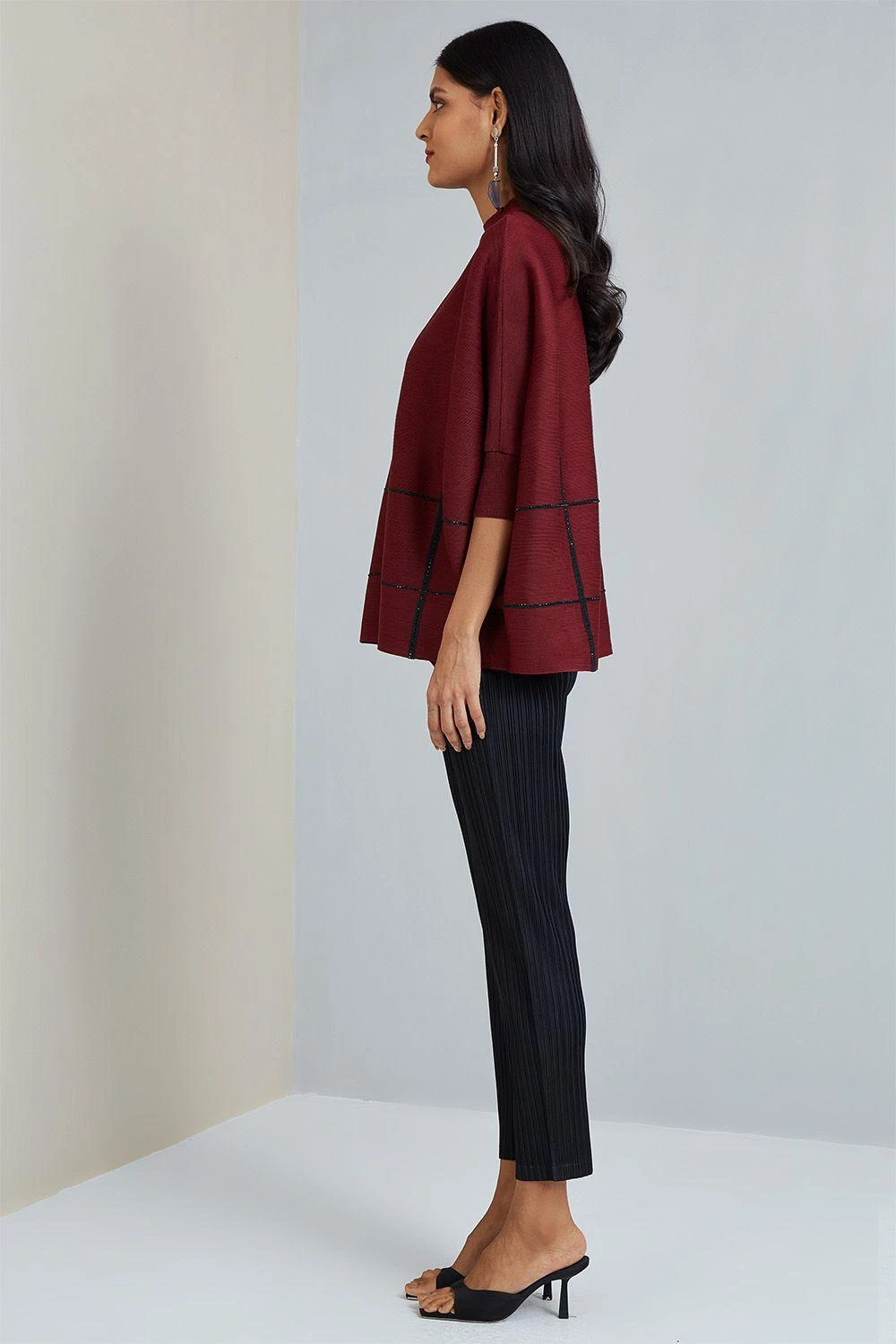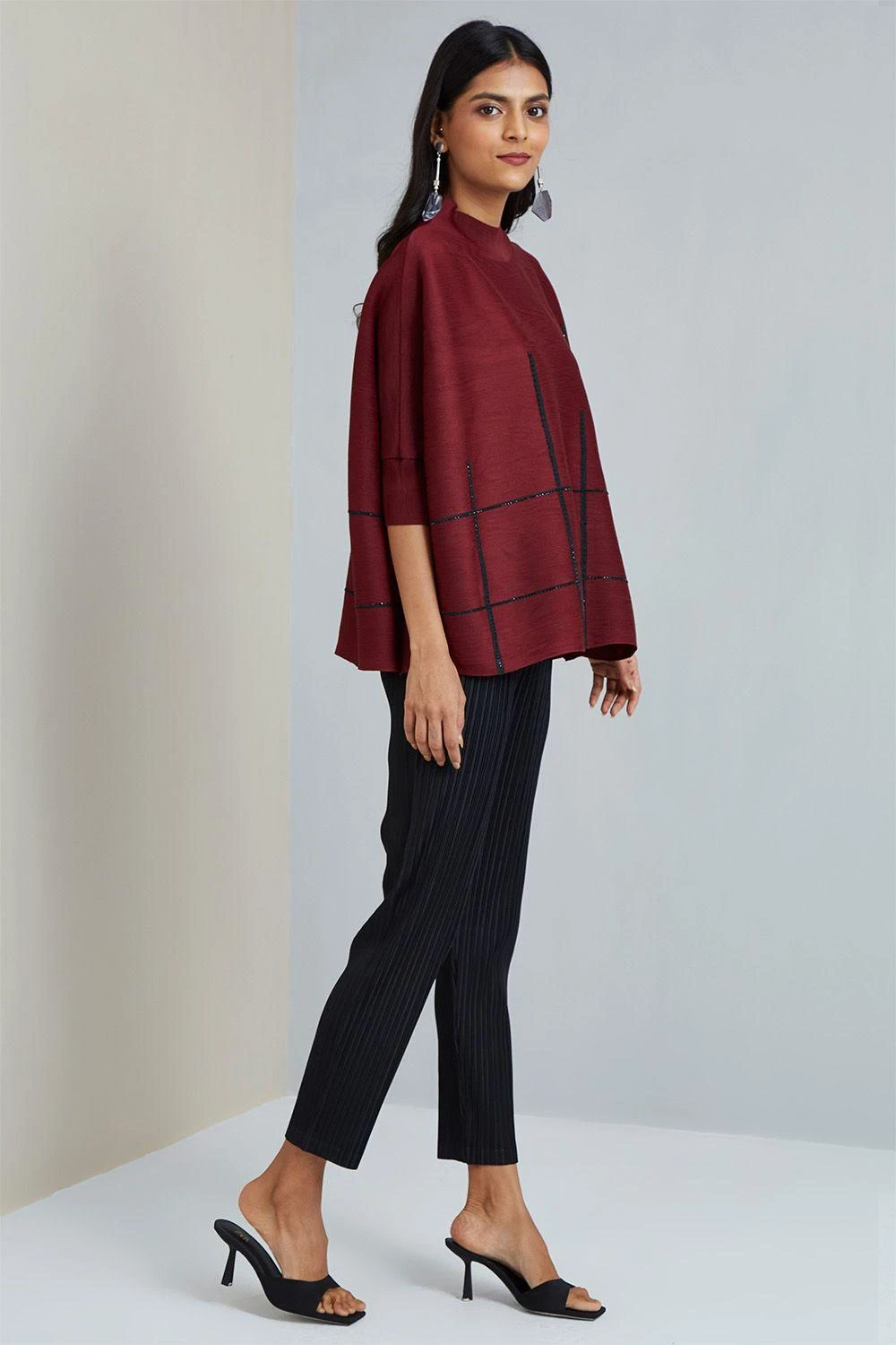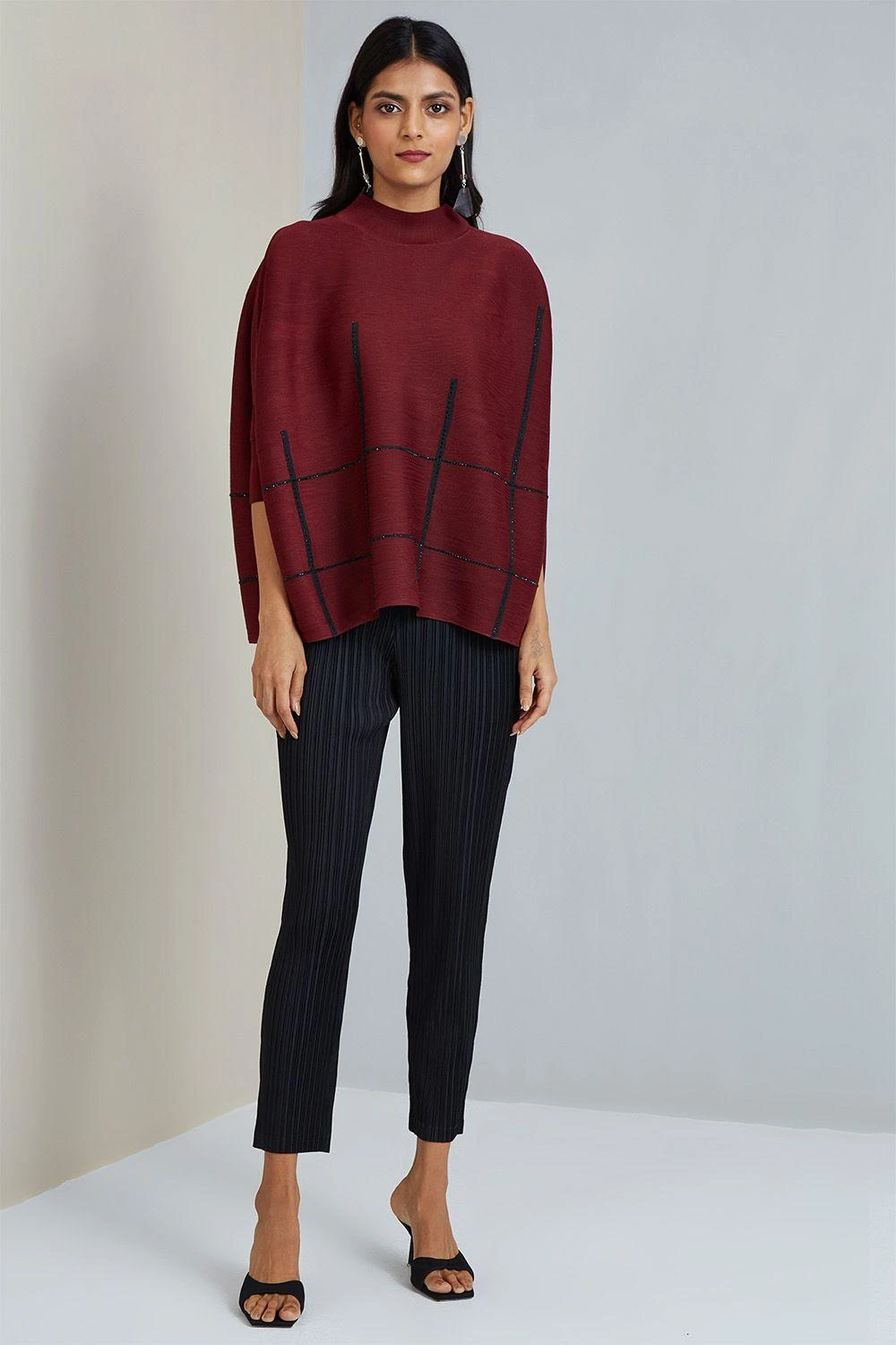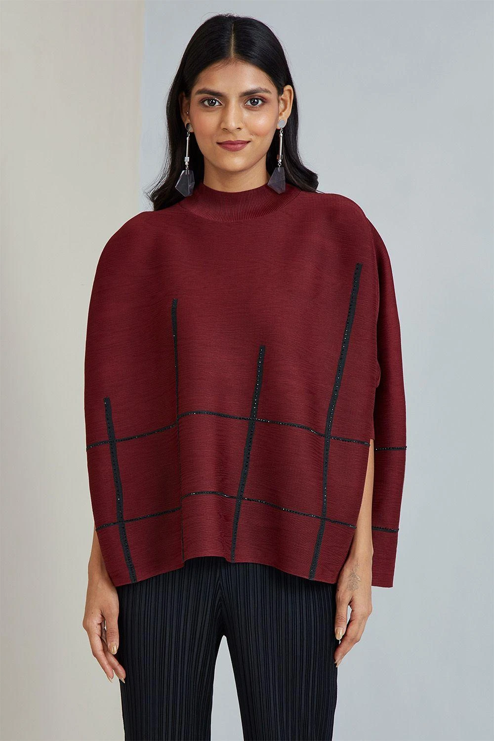 If you are looking for a stylish, warm, layered look, this maroon shoulderless top is made for you. It features a high neck, shoulder-less fitted sleeves and subtle embellishments. Pair it with pleated trousers & dainty earrings to complete the look.