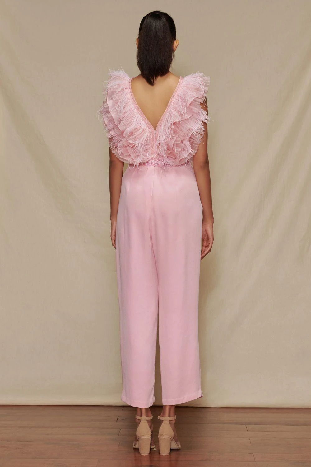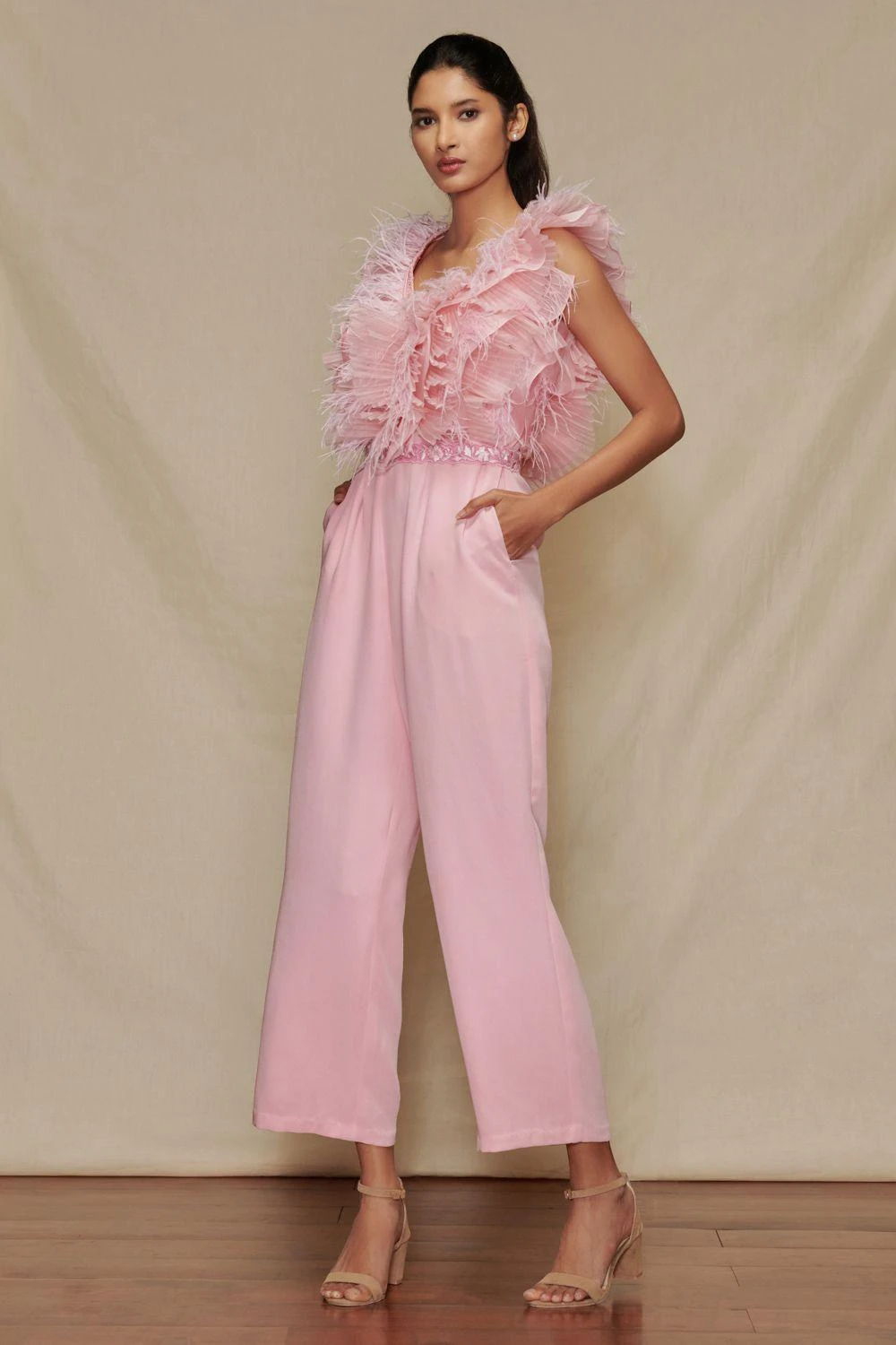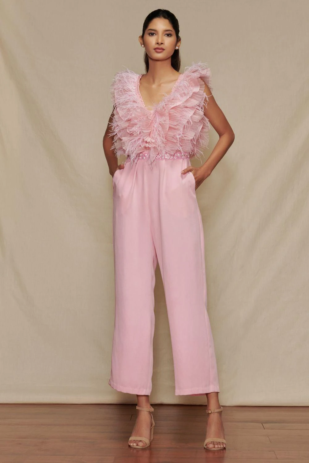 Embrace your inner drama through this blush pink jumpsuit. The bodice is extensively covered with feathers, while the bottom is kept plain in crepe base. It comes along with a belt for a cinched look.