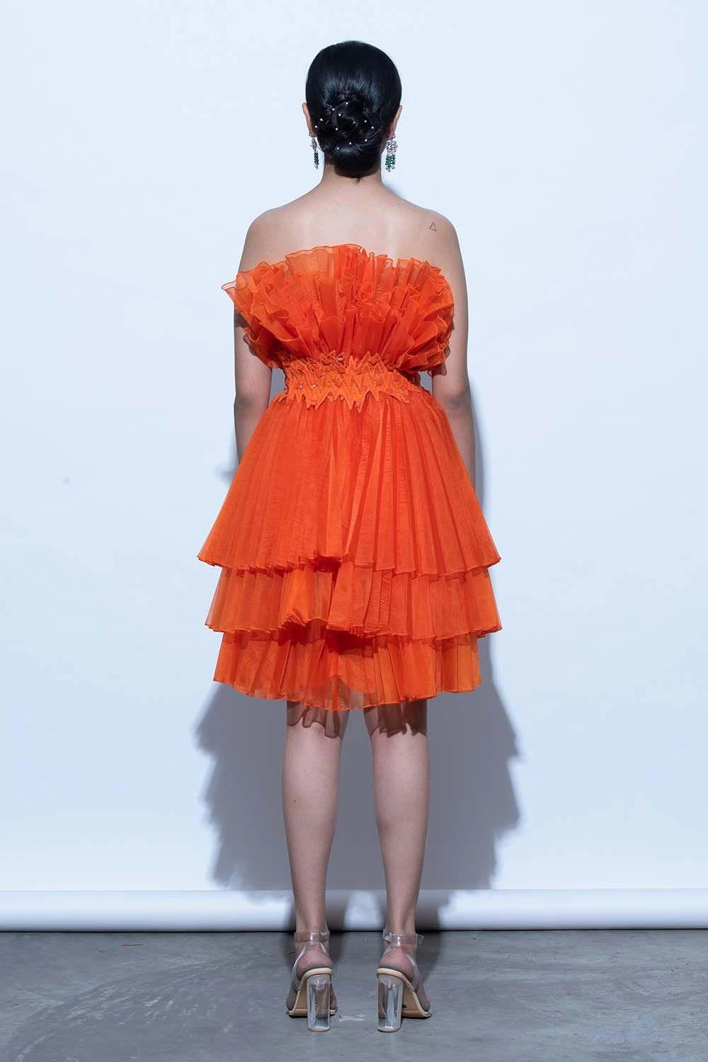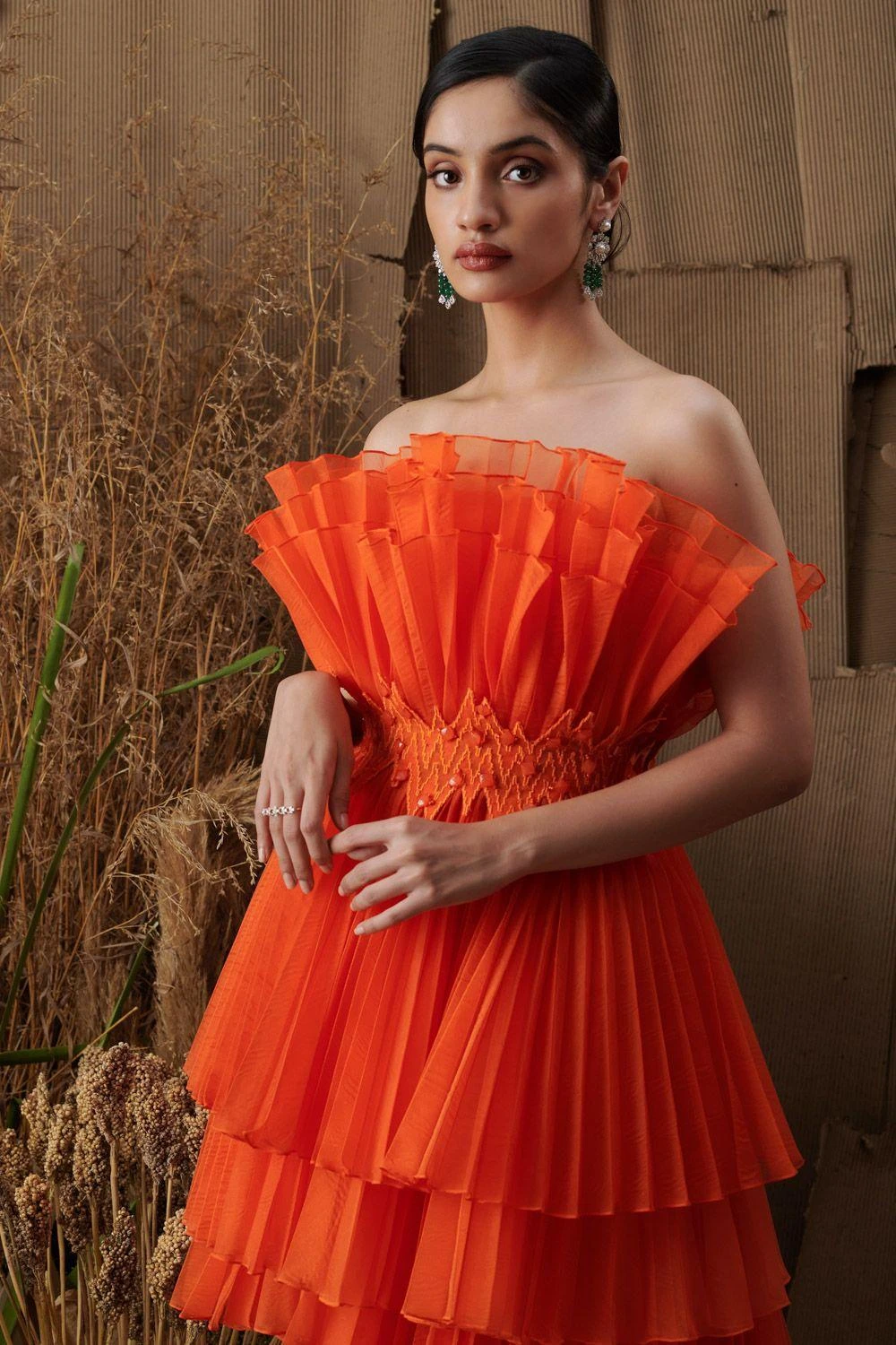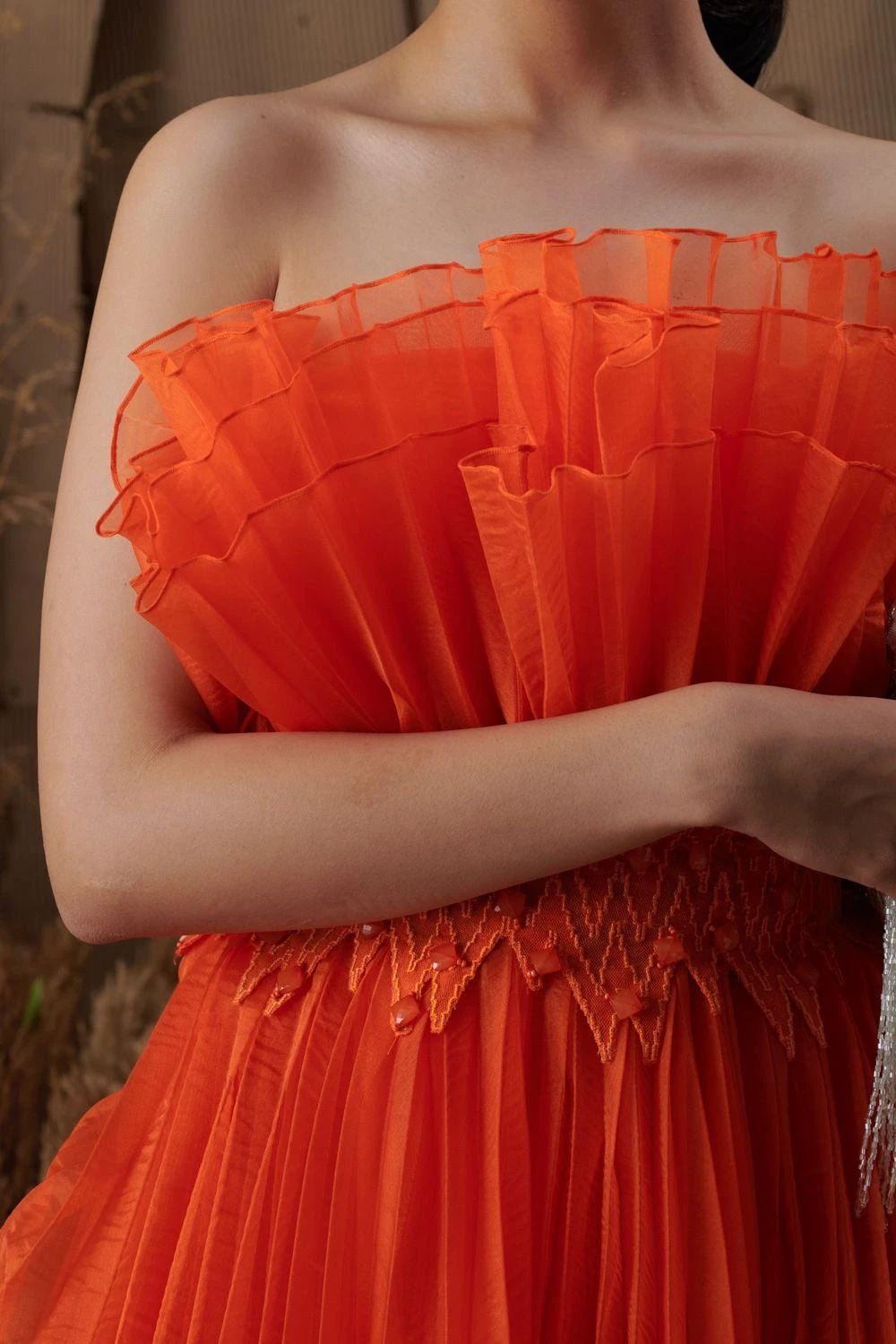 Attain a pretty and fierce look in the same outfit. An amalgamation of dreamy ethereal silhouette and eclectic bright palette. Made with meticulous craftsmanship, it features a signature cabbage ruffle, belted with chevron silk ikat.