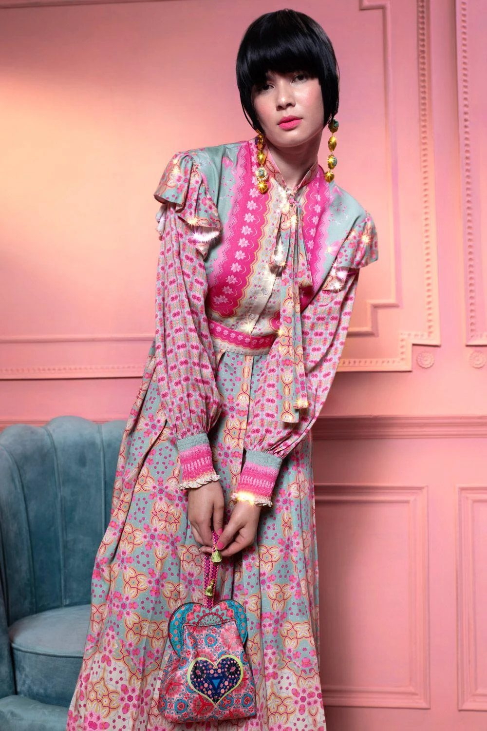Add a fun & playful zest to your holiday closet with this mint & pink printed dress. It is cut in pure crepe with a bow-tie neck and pleating details. You can keep it minimal with your accessories and let your outfit shine.