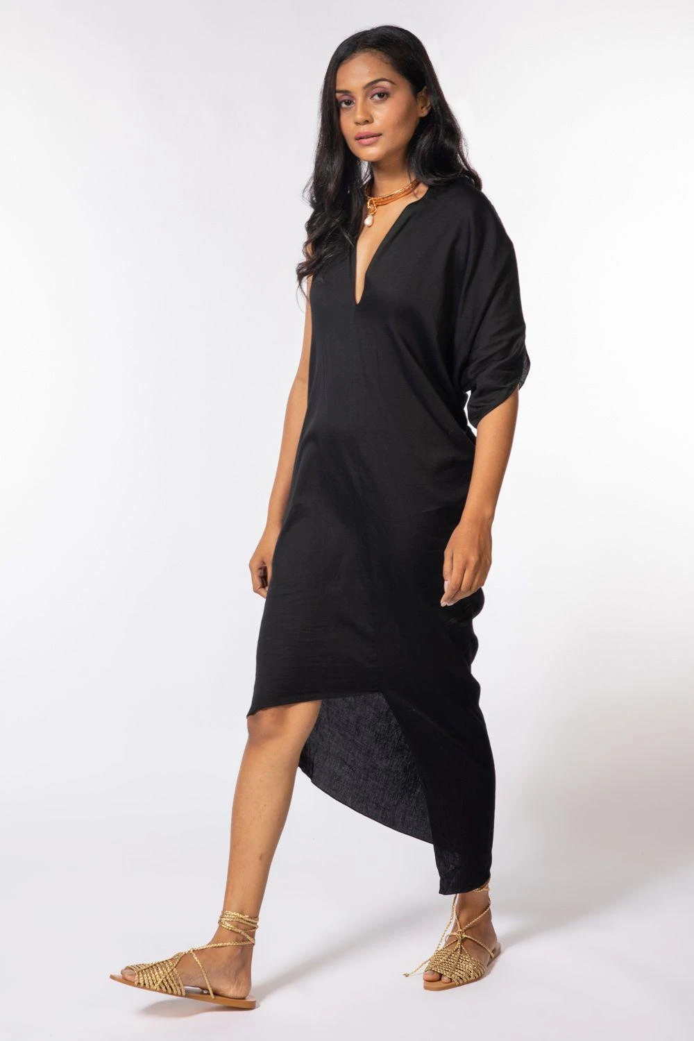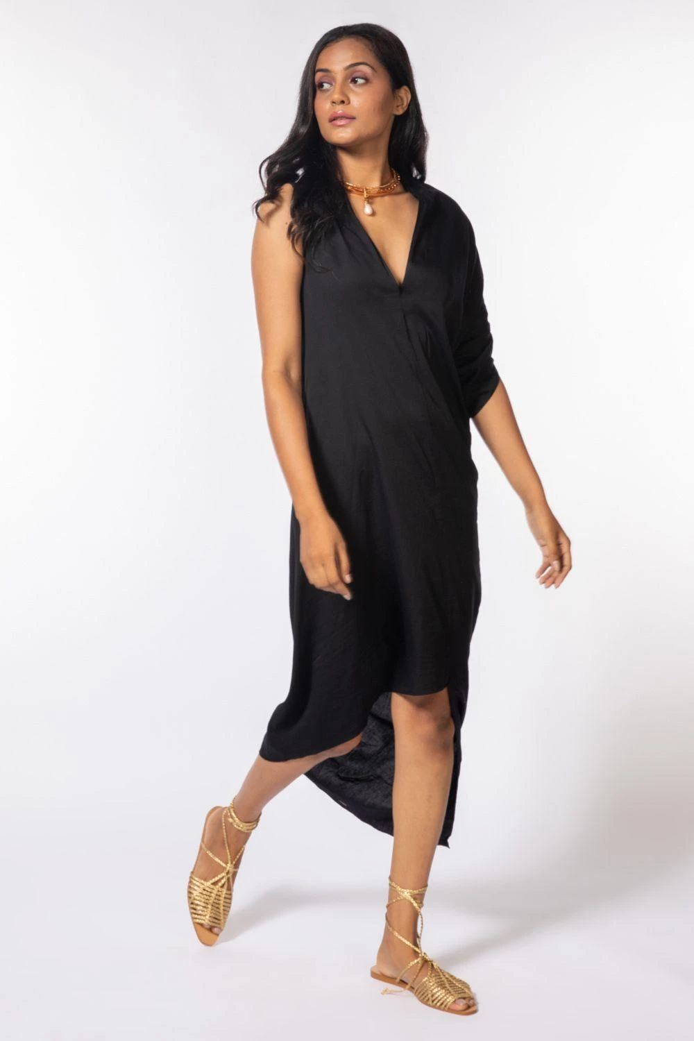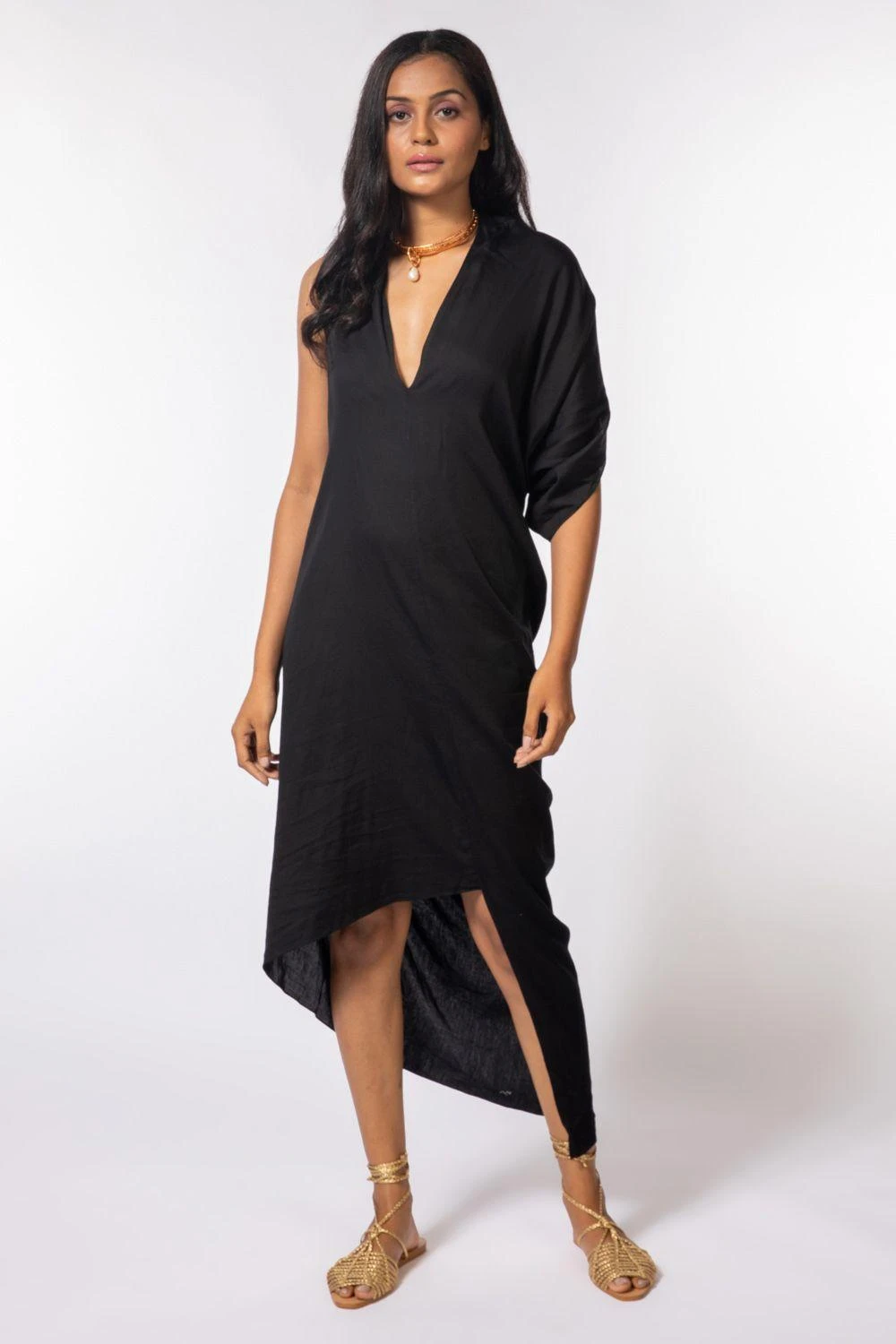 Make a fire statement in this black deconstructed dress. It features a sultry V neck & asymmetric sleeves & hem. The piece is sure to turn heads. You can style it with a chic choker & metallic heels for an evening out.