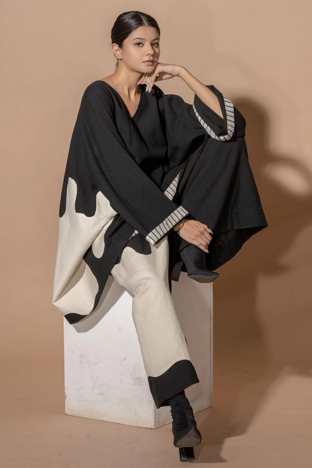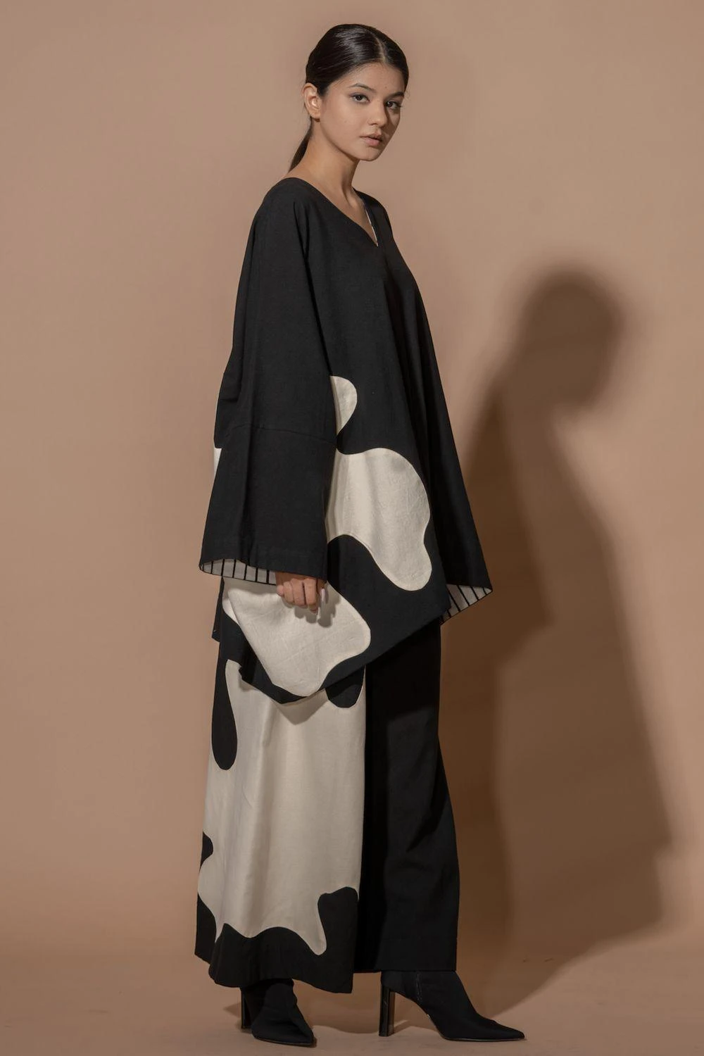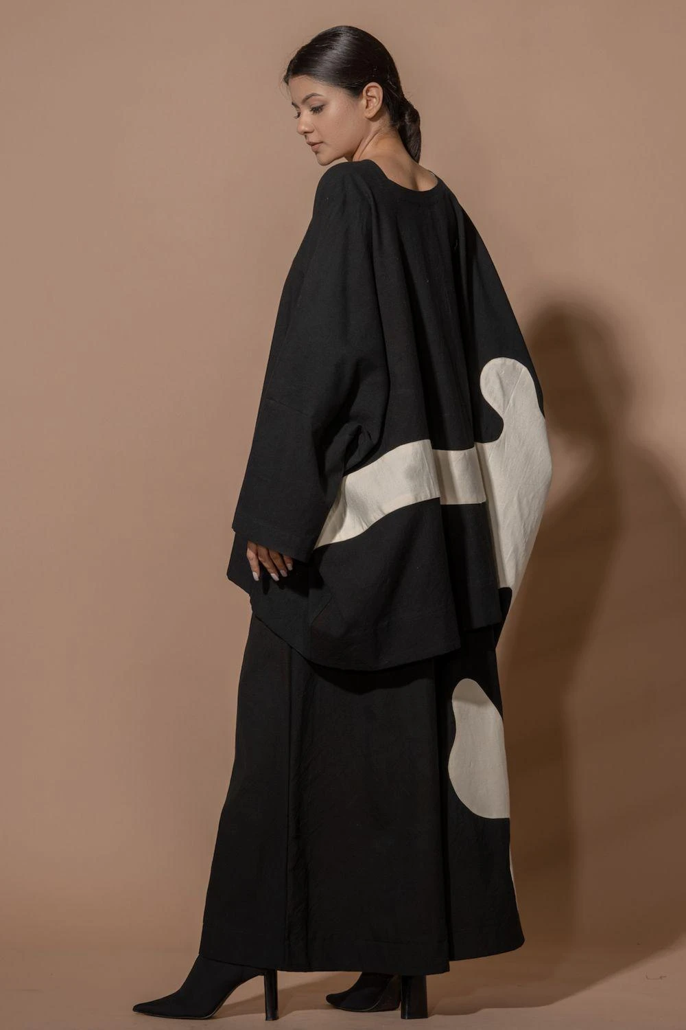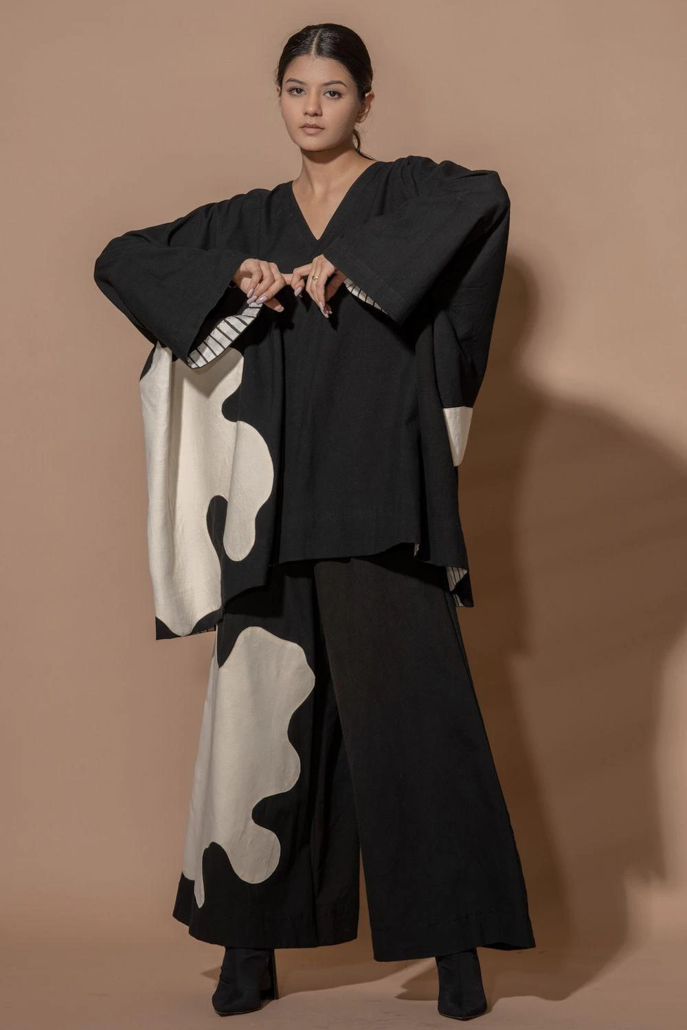 Indulge in the luxury of this oversized kimono-style shirt. With intricate appliquÒ and contrasting facing, it’s a statement piece that exudes sophistication and elegance. Elevate your fashion game effortlessly.