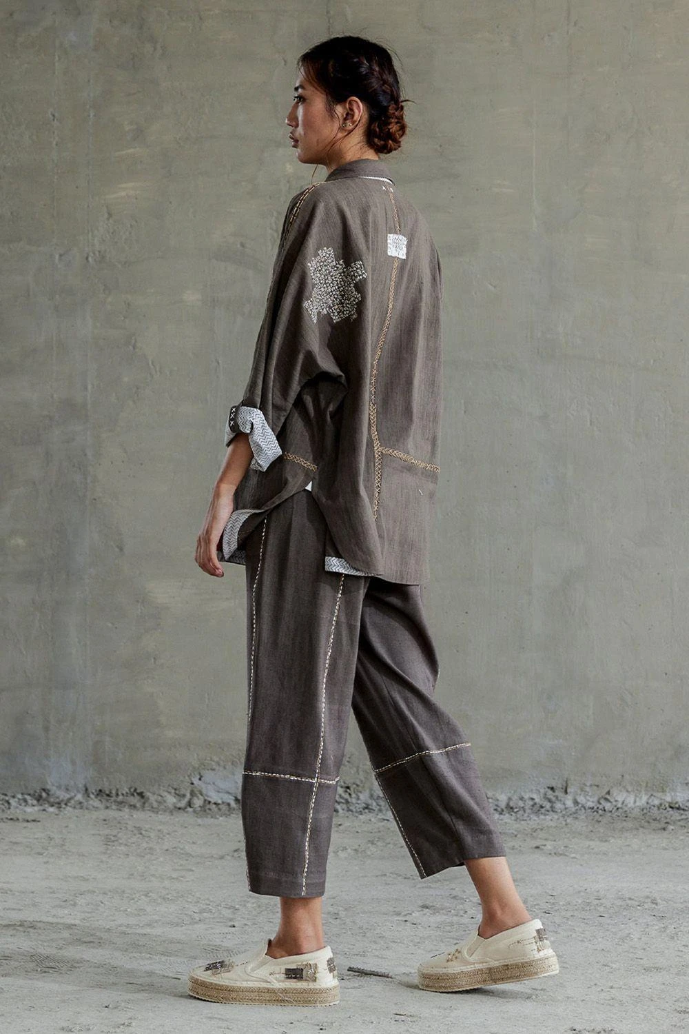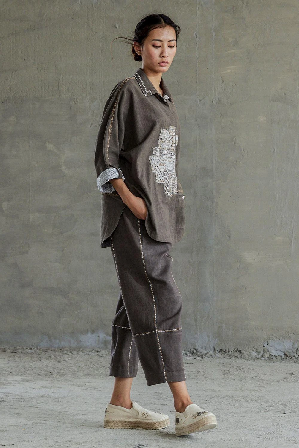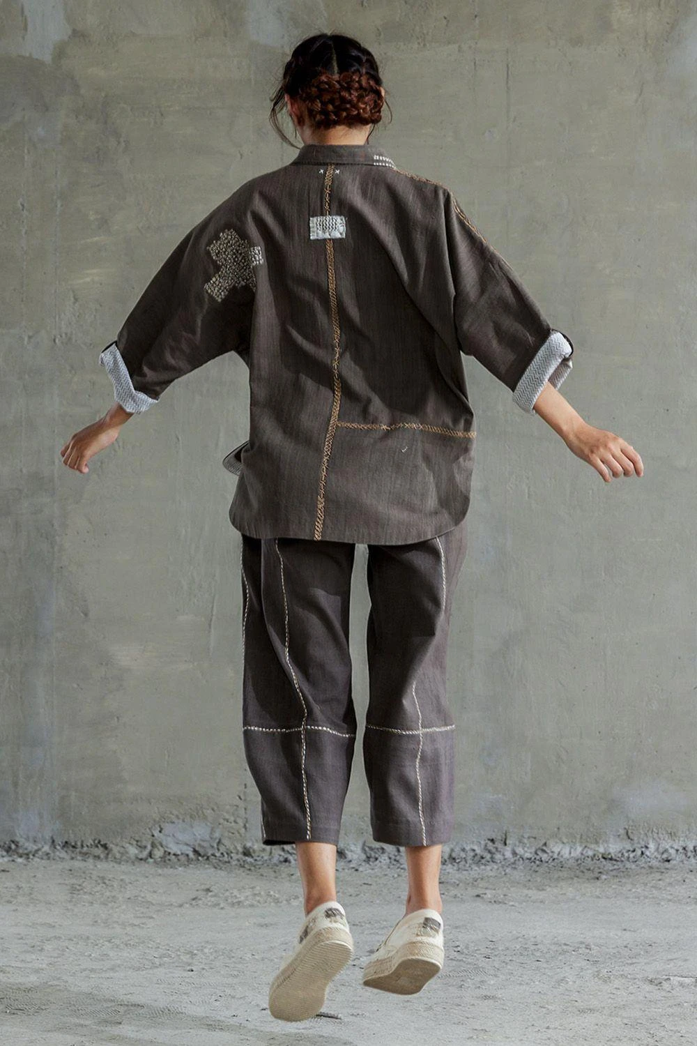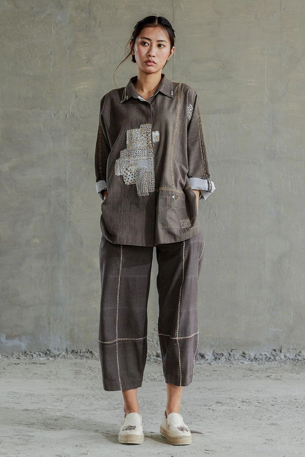 This handspun cotton oversize shirt comes in a brown colour along with a classic collar, concealed front button fastening, and kimono style sleeves. The shirt features patchwork in the boro style with sashiko stitch accents.