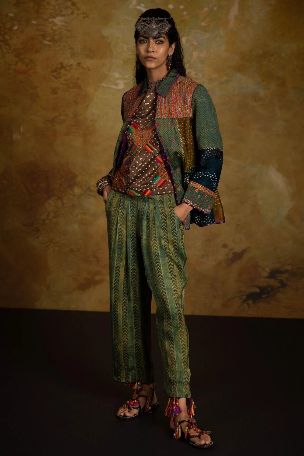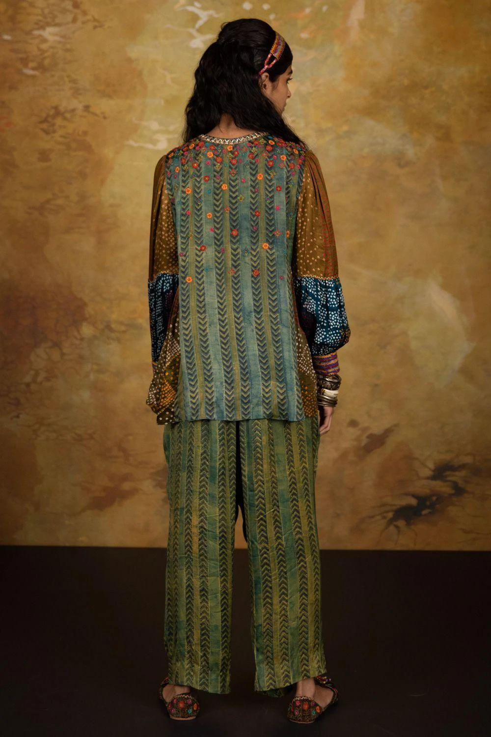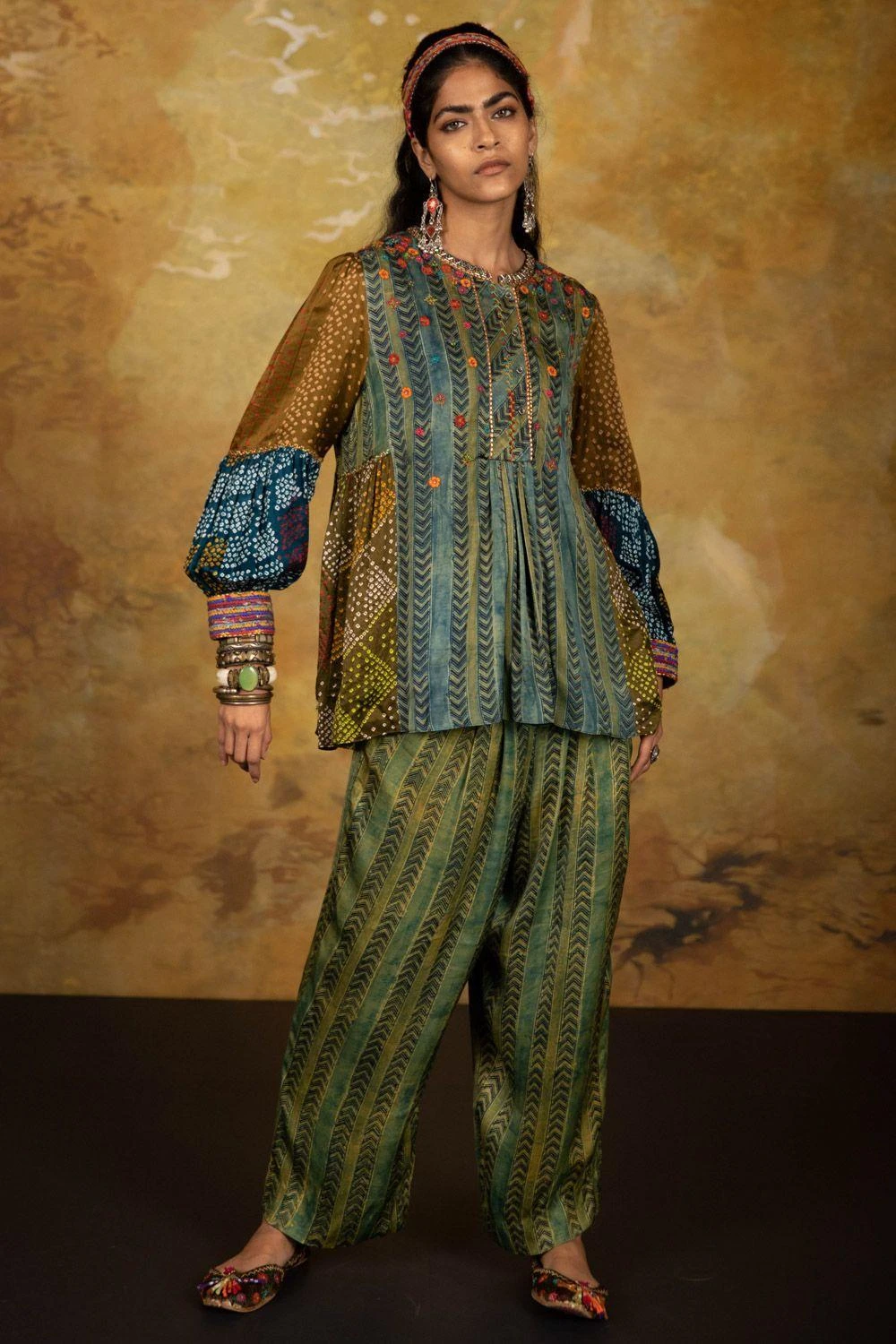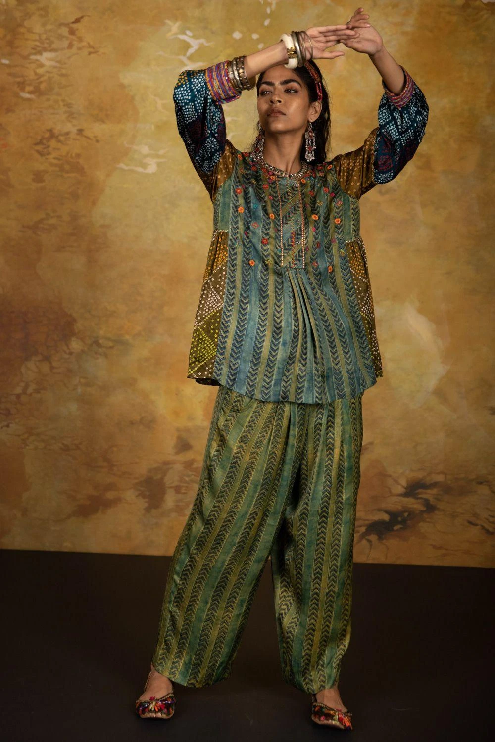 These green smocked pants are set in a luxe modal silk. Style this versatile piece with a breezy kurta or tunic.