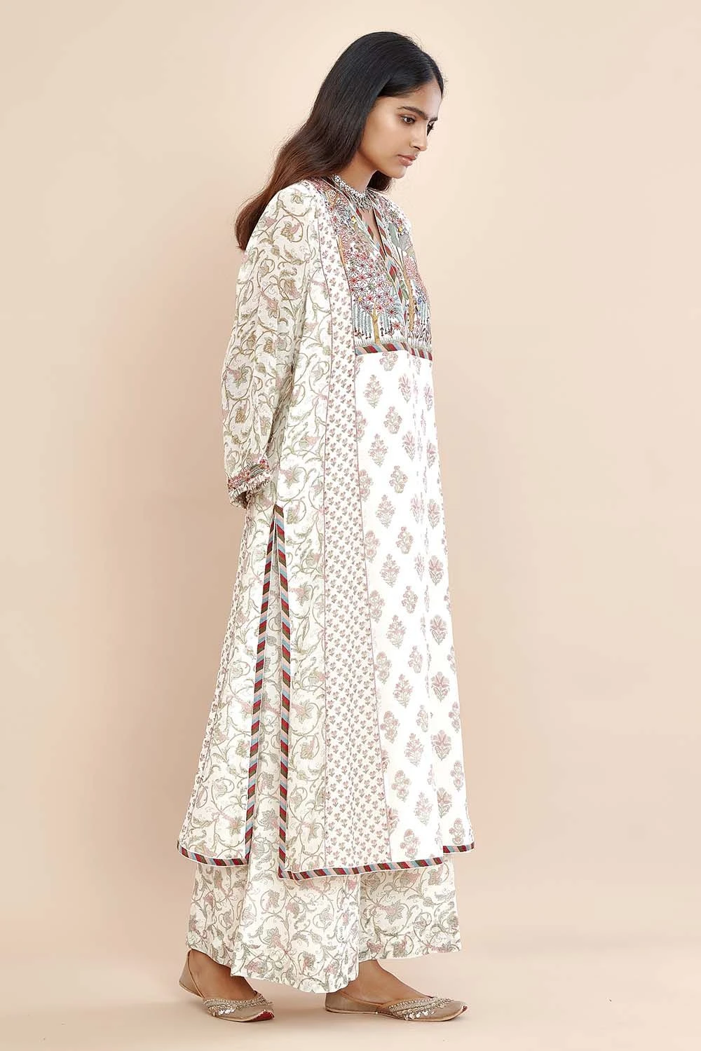 A relaxed and breathable panelled Ijar pant, features an interplay of floral chanderi hand block prints and pastel hues. Pair it with the panelled kurta and lehriya dupatta from the collection. Summer is already looking good.