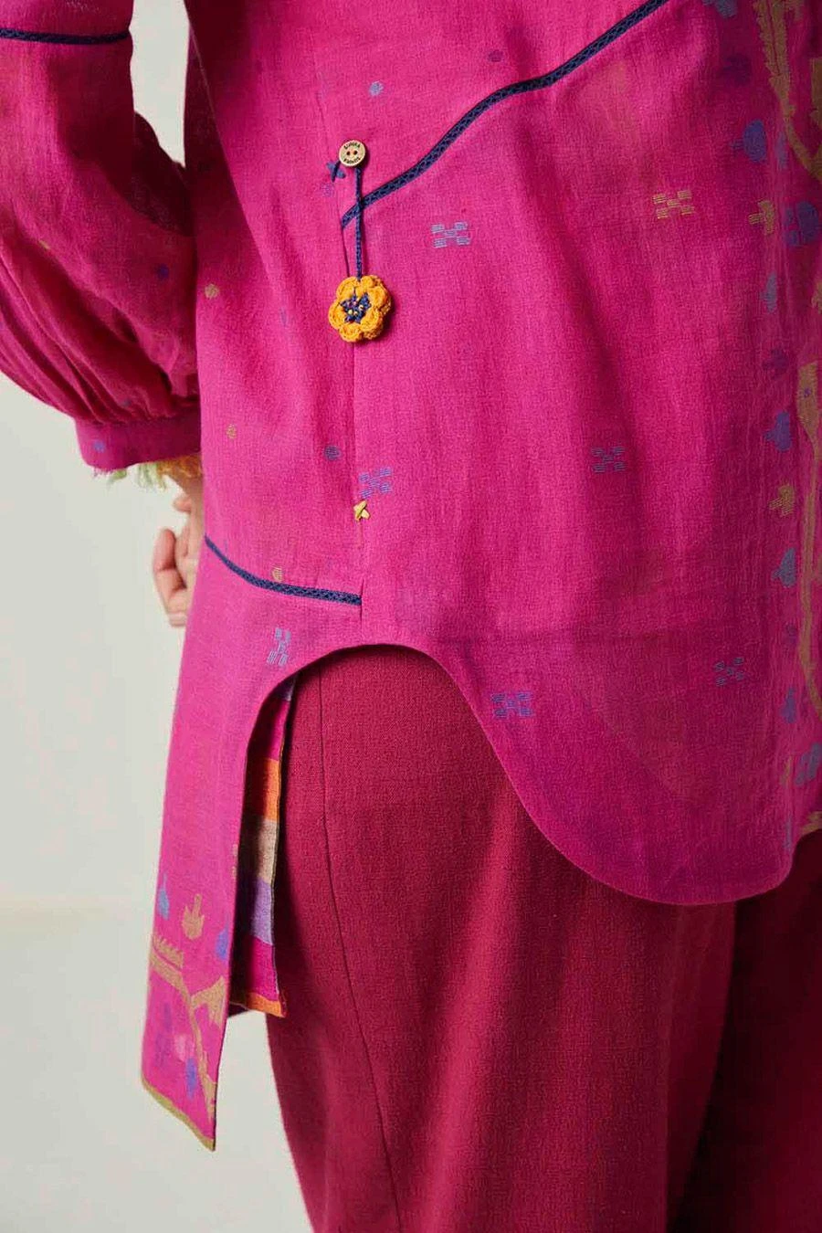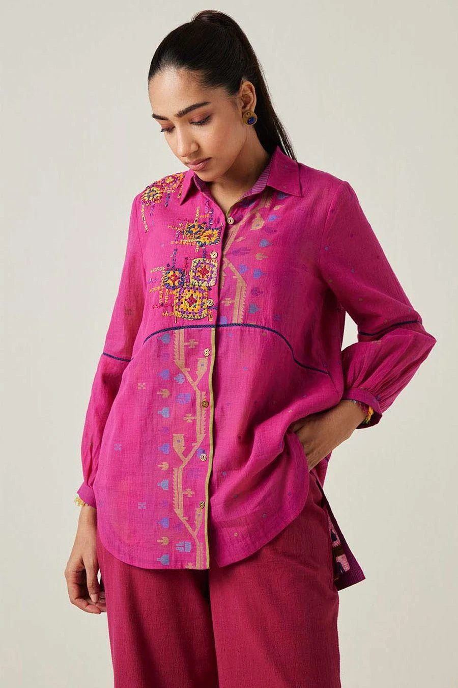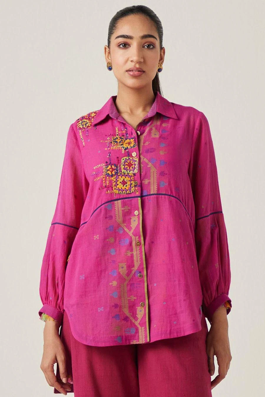 This shirt in jamdani muslin textile features a classic collar with full sleeves with an asymmetrical curved hem. The shirt has a striped smocked back yoke with intricate multicoloured crocheted knitted patches & blocks stitched on a loom.