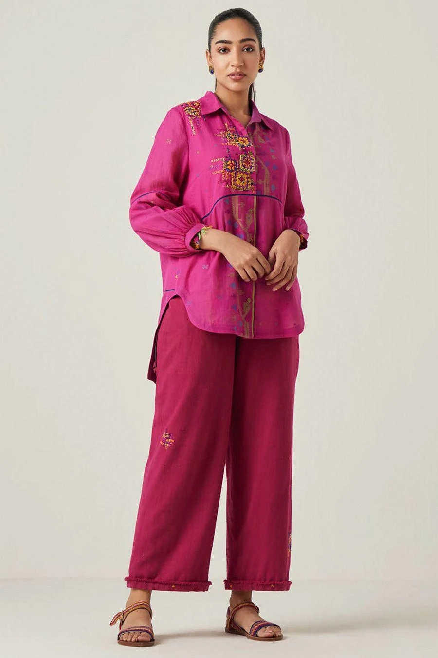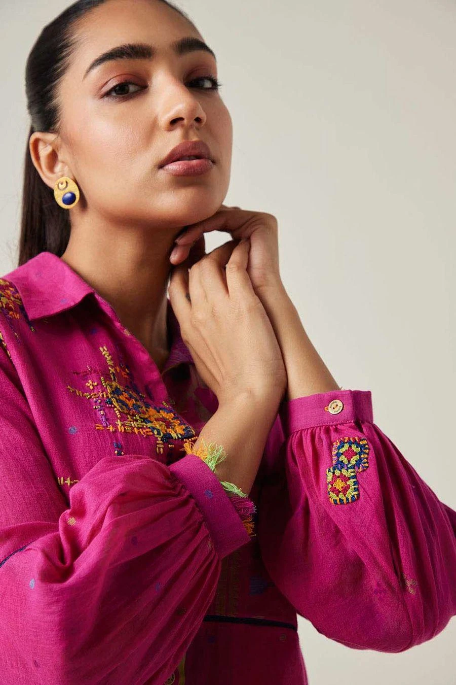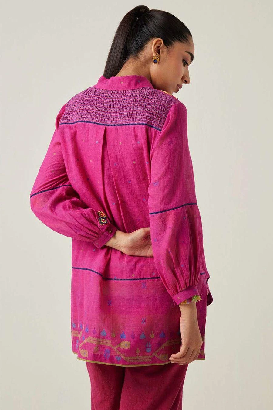 This shirt in jamdani muslin textile features a classic collar with full sleeves with an asymmetrical curved hem. The shirt has a striped smocked back yoke with intricate multicoloured crocheted knitted patches & blocks stitched on a loom.