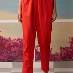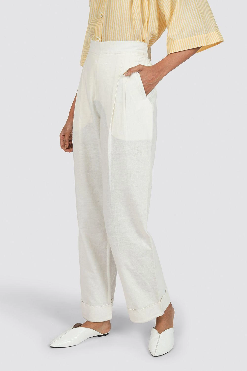 These easy pleated trousers in handwoven cotton chanderi with a cuff detail at the ankle will look great with a stylish top or an Indian tunic. A handy addition to your wardrobe!