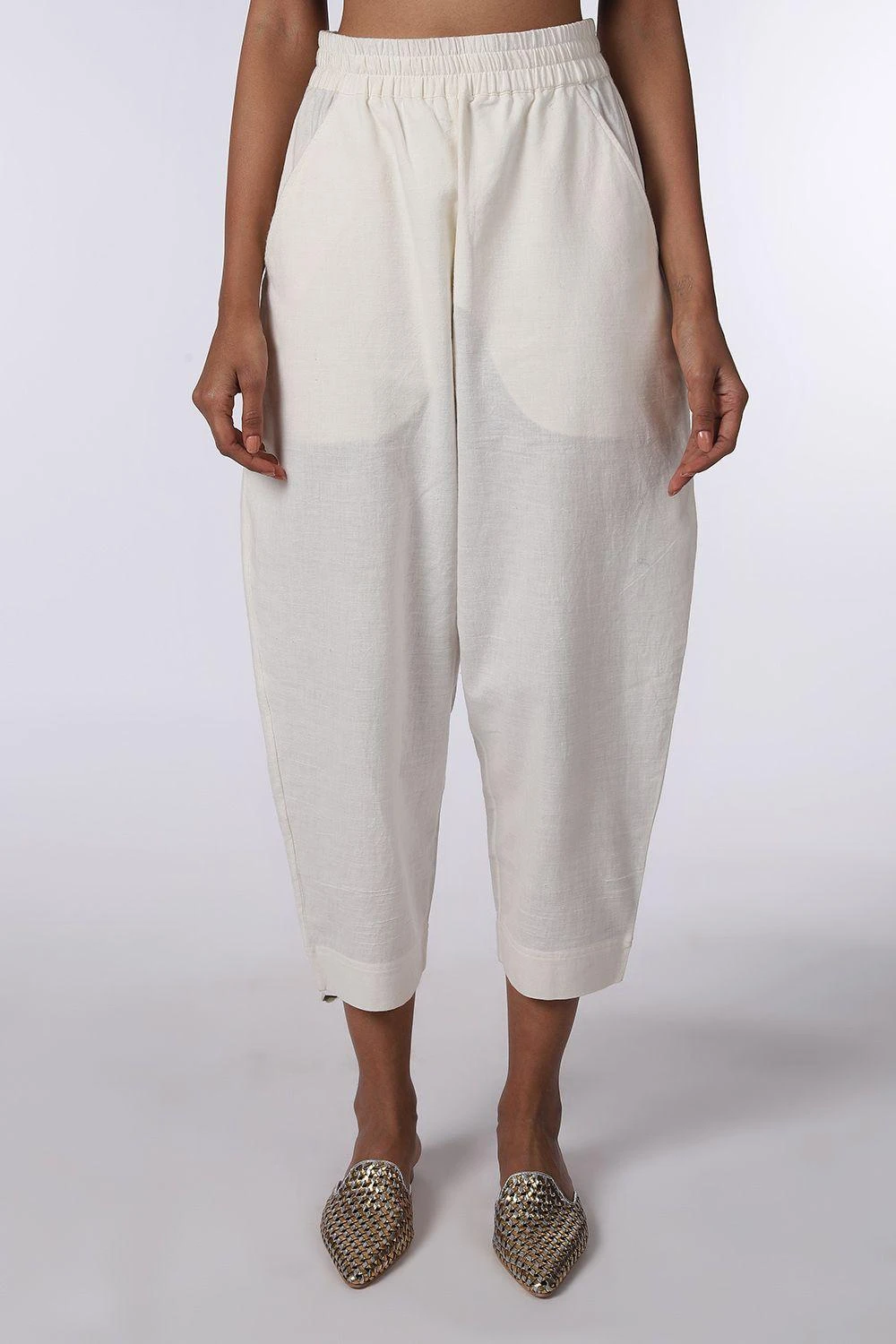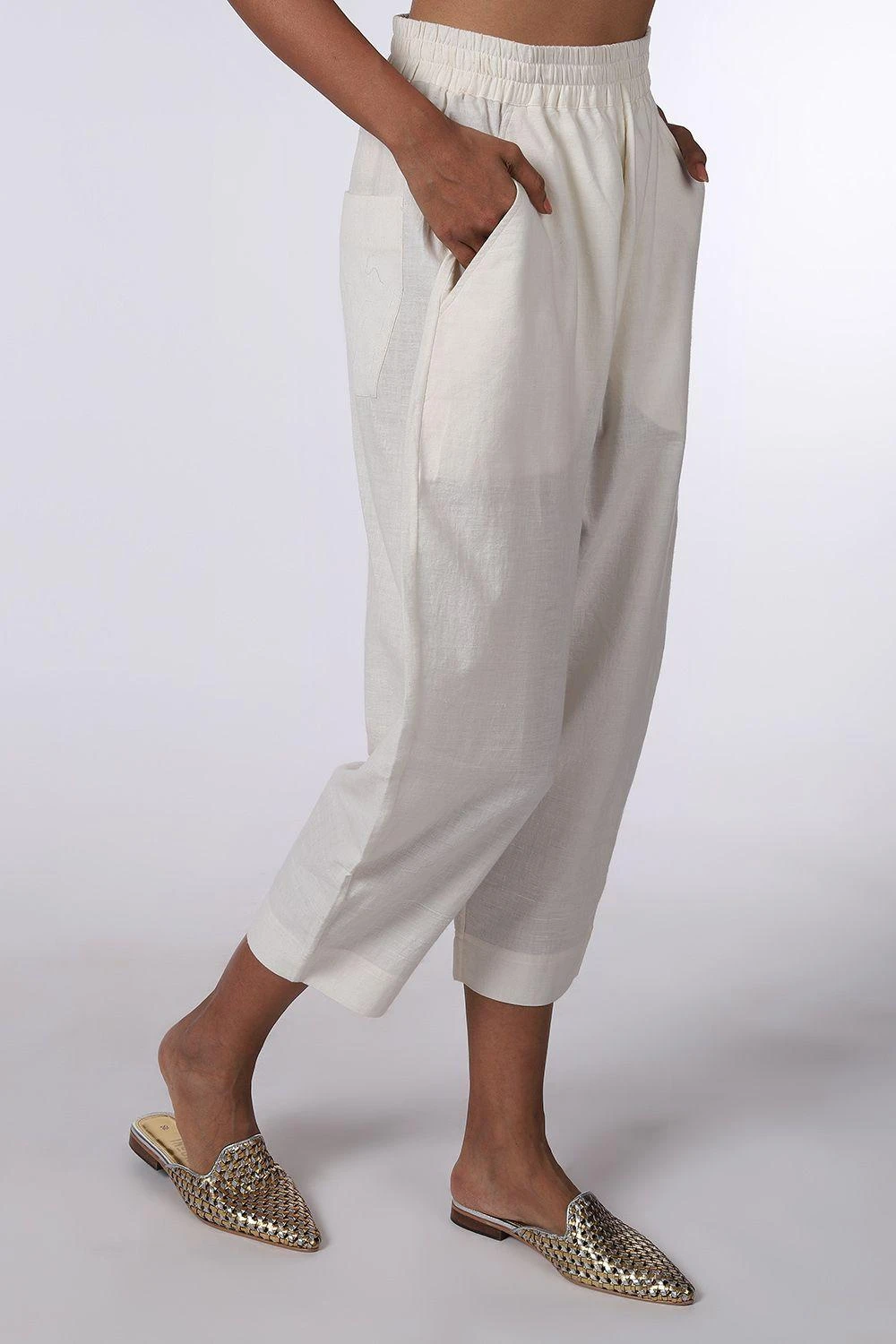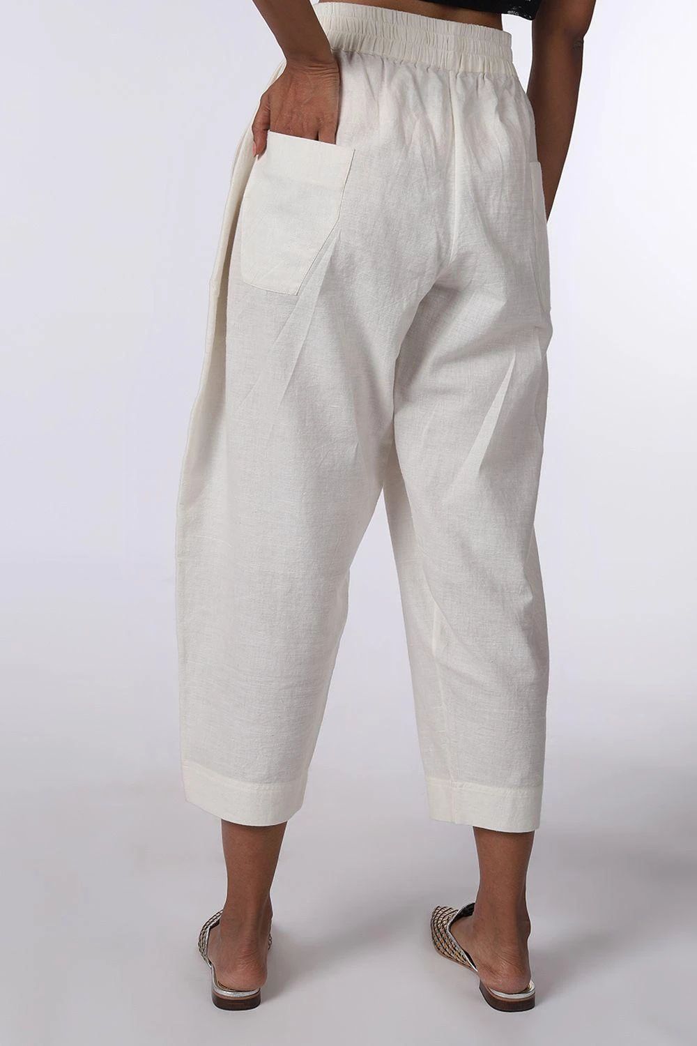 SWGT’s high waisted khadi trousers feature a cuff at the ankles, and can be worn on a day in or night out.