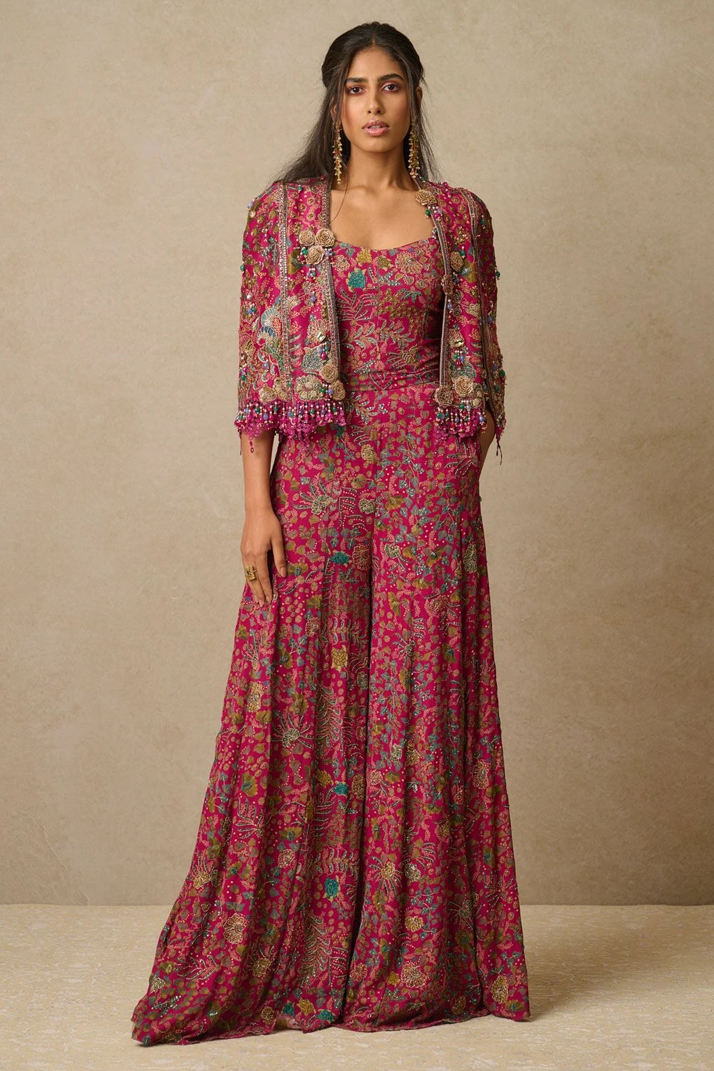 Look effortlessly stylish with this floral embroidered gilet with zardosi & aari work paired with an intricately embroidered jumpsuit. Add a pair of statement earrings to complete the look.