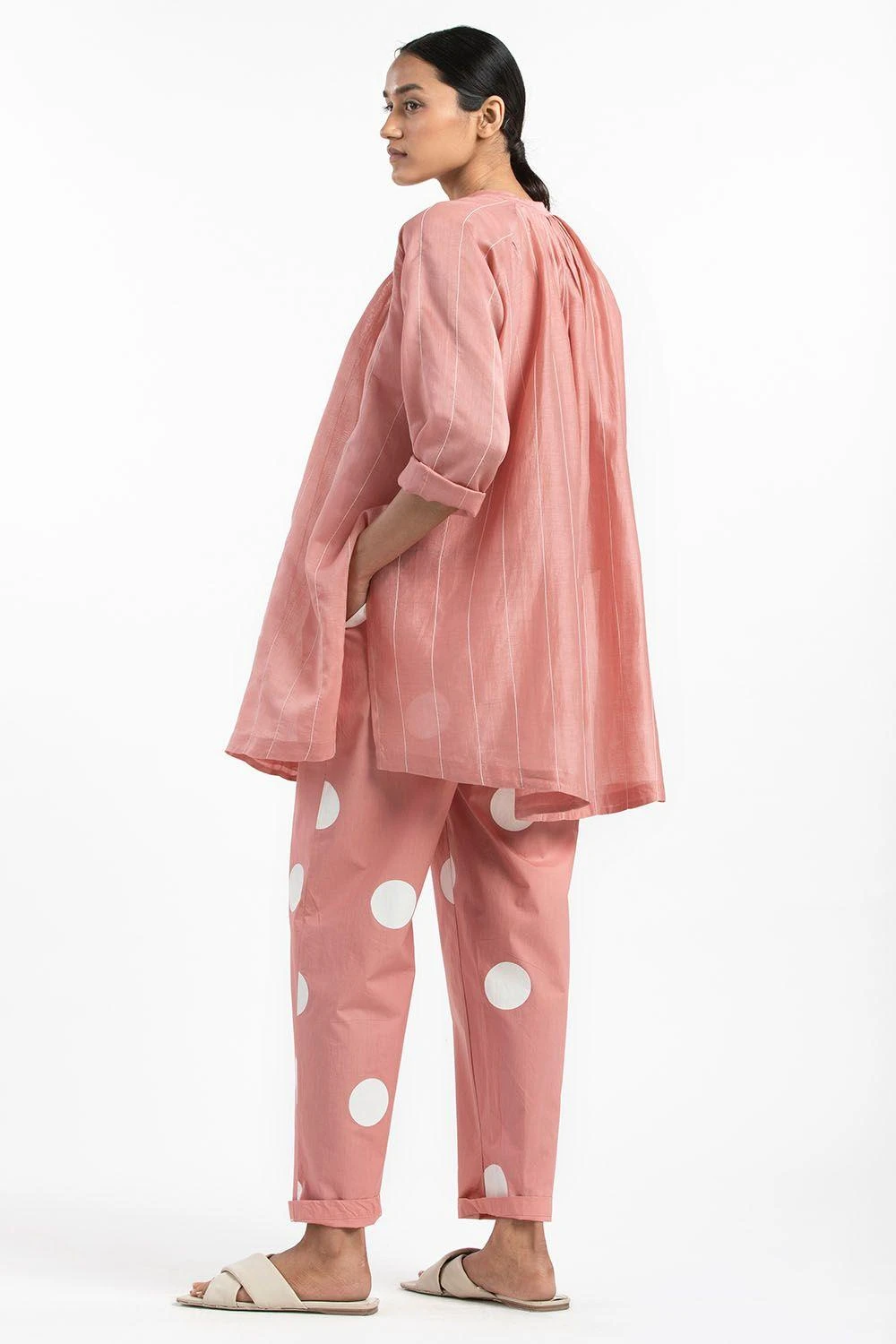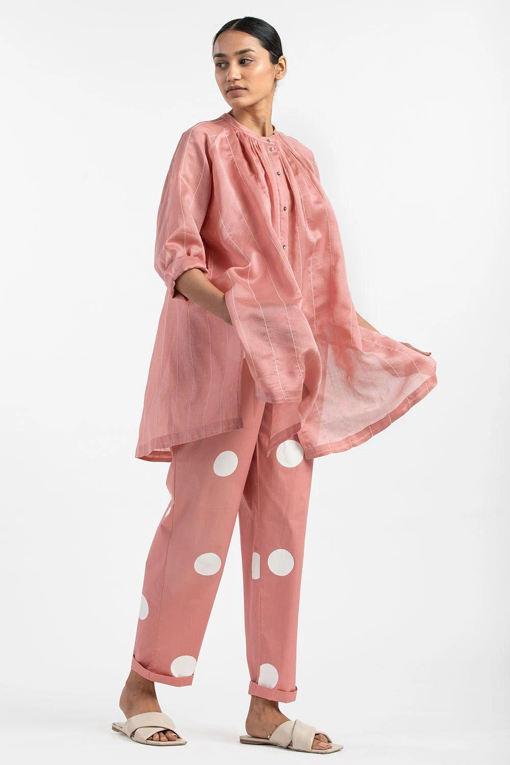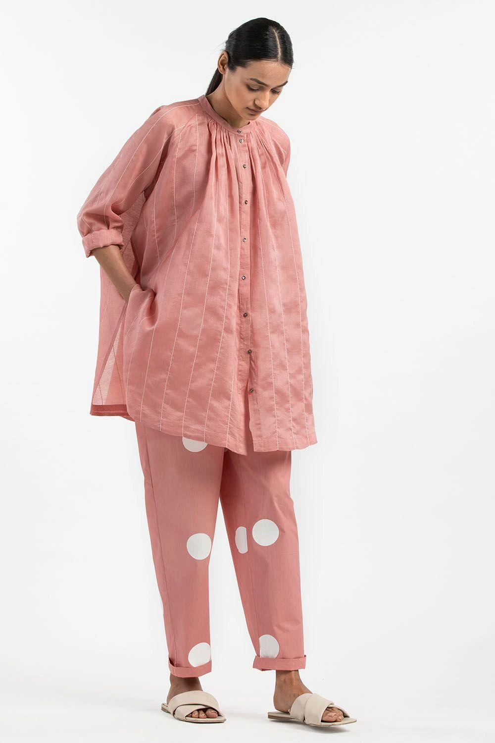 Made in chanderi, this dusty rose tunic is enhanced with hand woven stripes and pleat detailing in the neck. It can be paired with dusty rose pants or jeans for a complete semi formal ensemble.