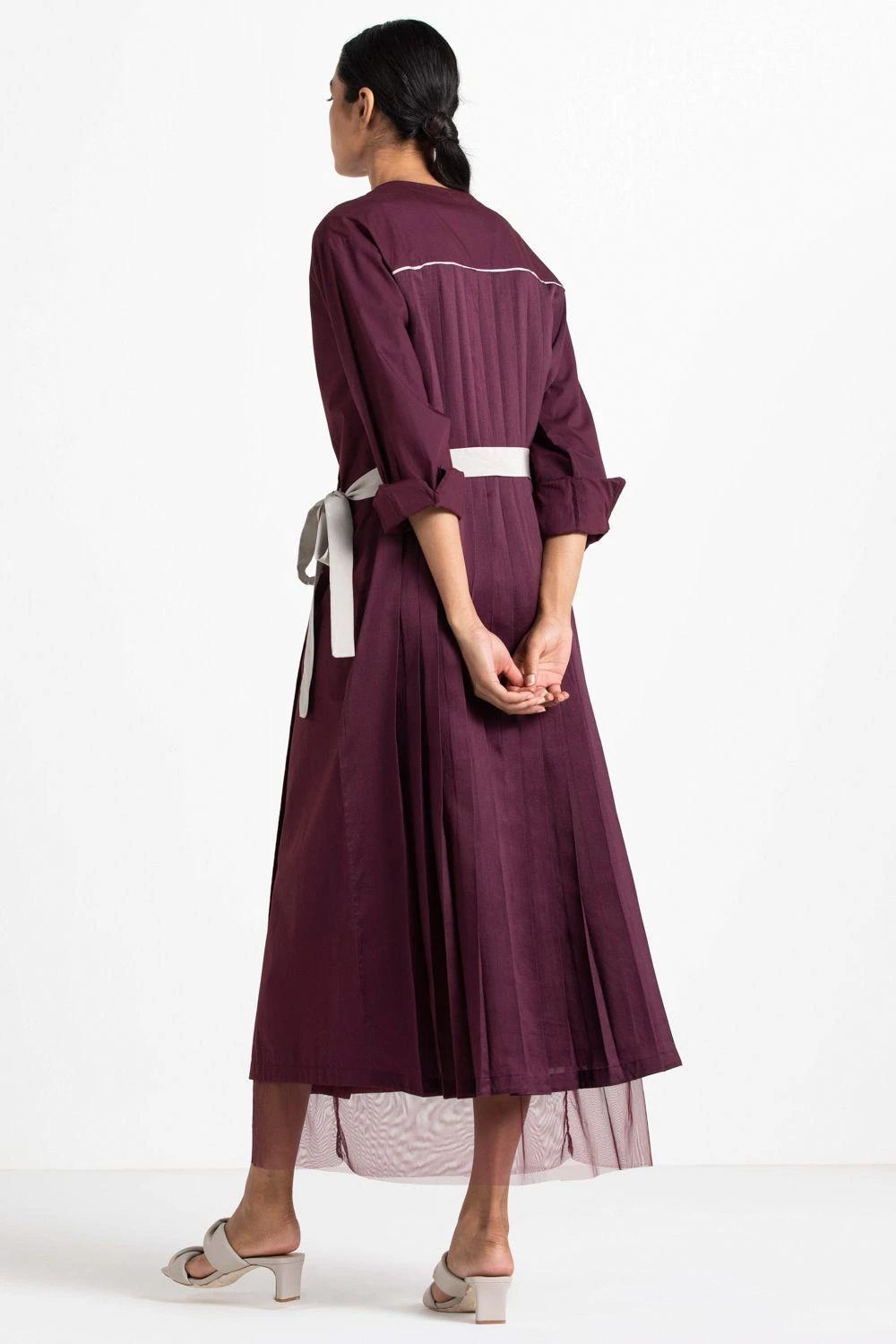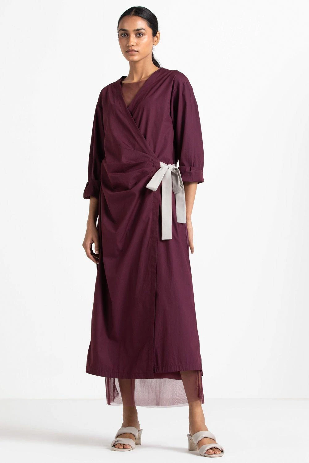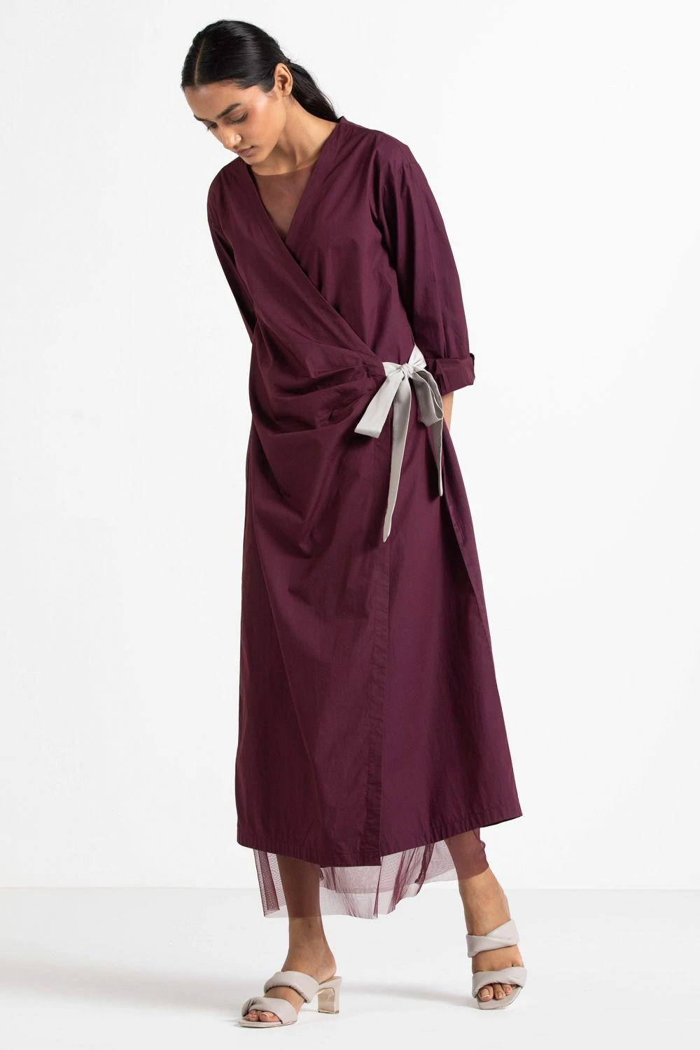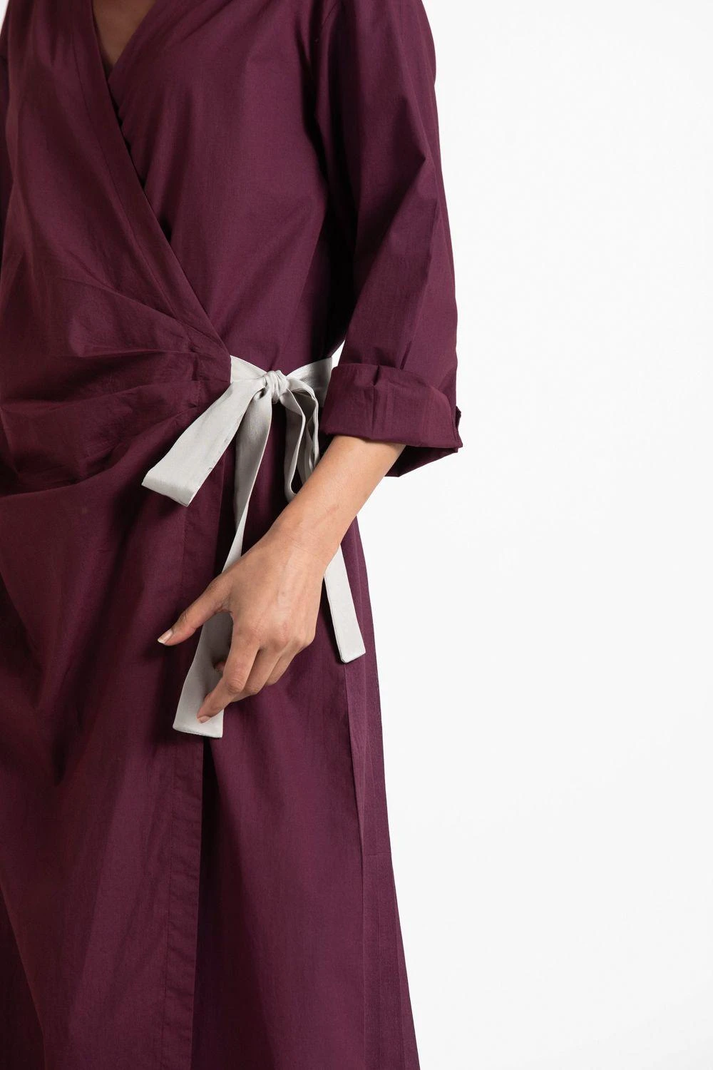 This wine wrap dress is a great pick to go from day to evening in style & comfort. It is cut in cotton poplin with chanderi pleats at the back. It comes with a net slip underneath. Add a pair of sneakers with this look.