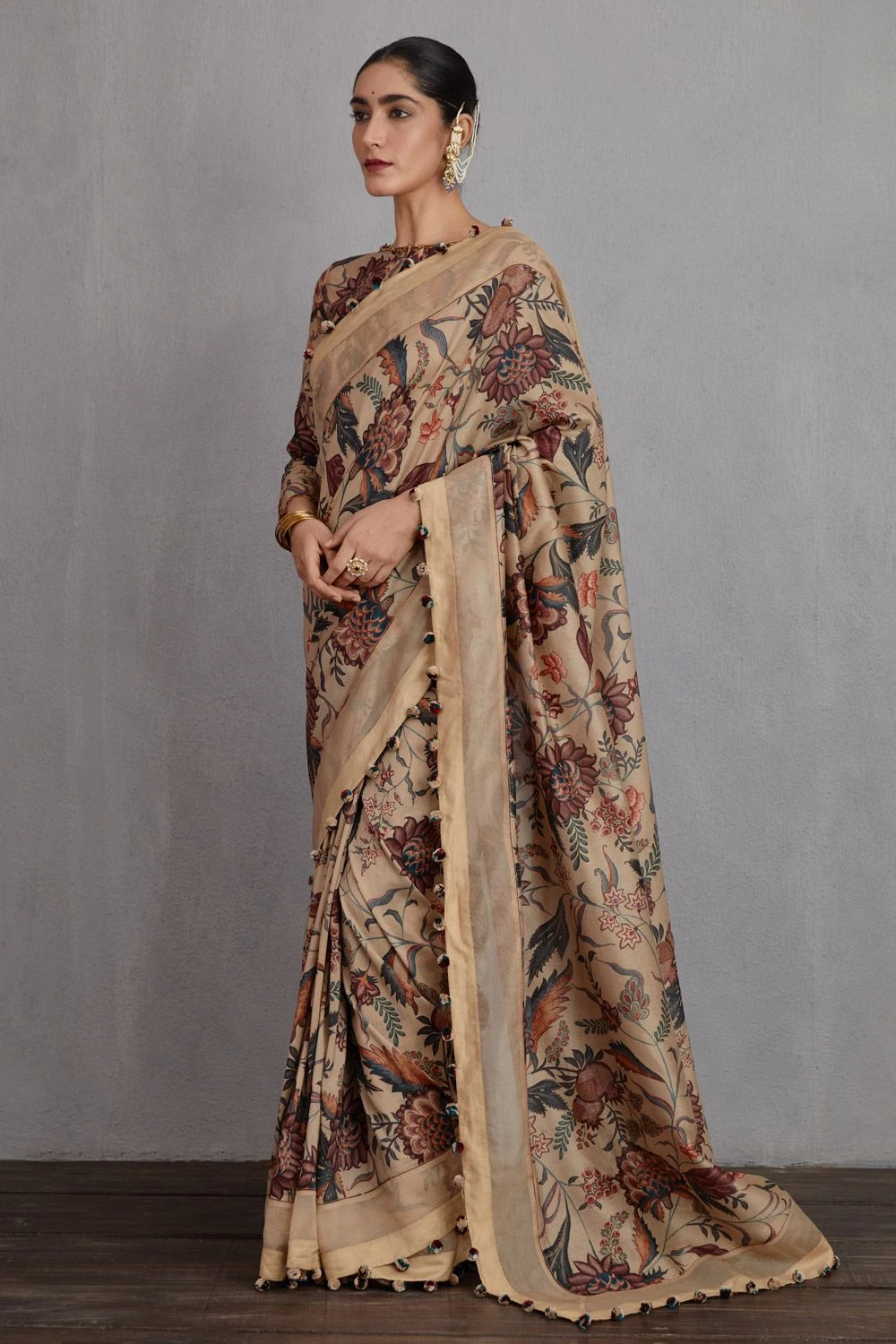 This natural beige printed blouse will perfectly complement your solid silk saris. It is woven in 100% cotton silk and features a front button placket.