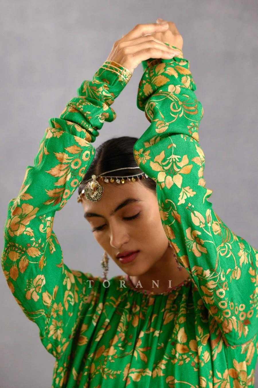 The perfect amalgamation of style & comfort, this dress works across occasions. Crafted in slub silk, this dress features a bhagalpuri print with churidar sleeves. Add a pair of statement earrings to complete the look.