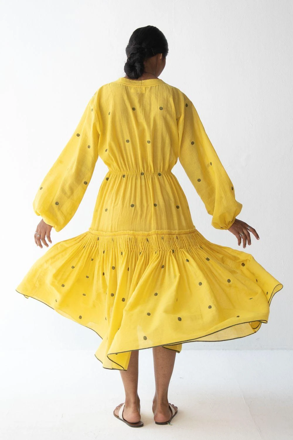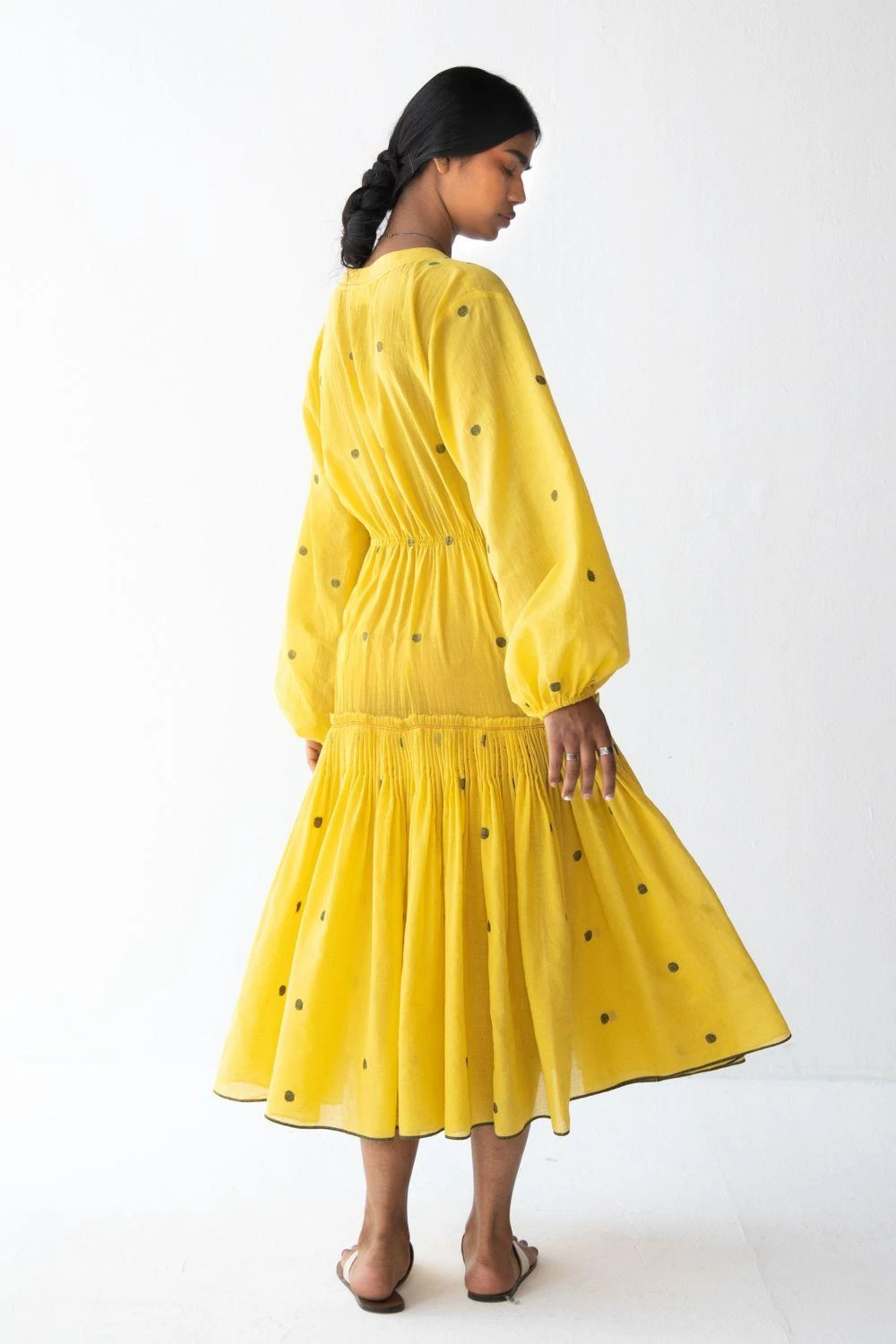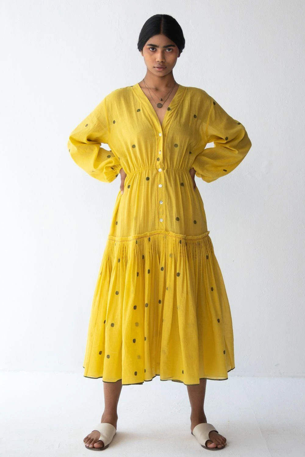 Make a flair this summer in this yellow tiered dress. It is made in handwoven dotted cotton jamdani with kantha detail. Its fuss-free, feminine silhouette makes it ideal for a summer getaway.