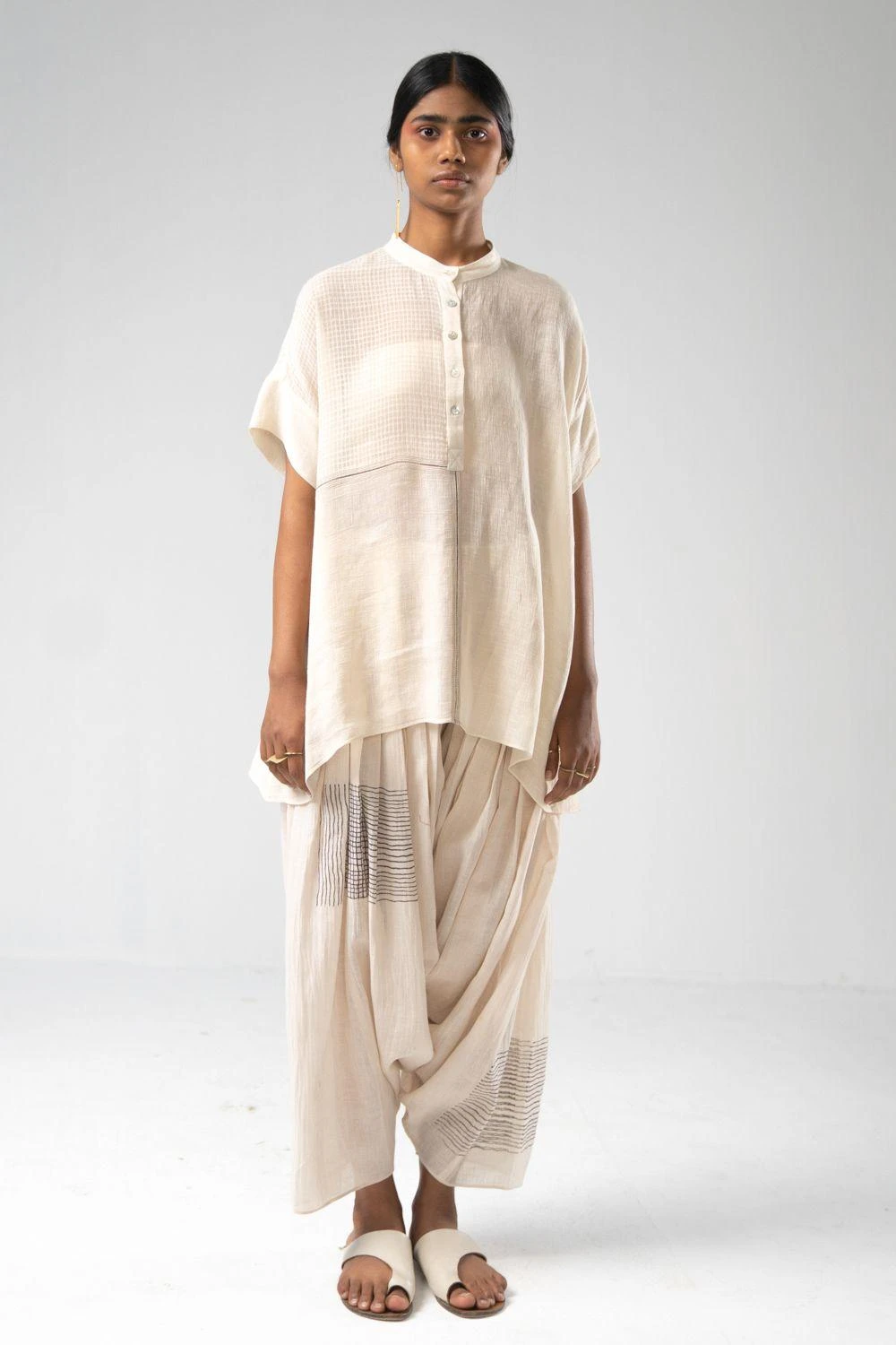 This handwoven striped top is easy going & comfortable. It is cut in cotton in panels with a front placket. Style it with a pair of coordinating linen pants and add bold golden hoops to complete this sublime look.