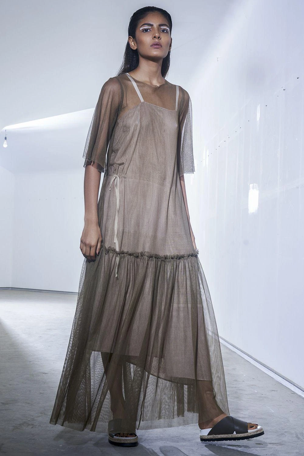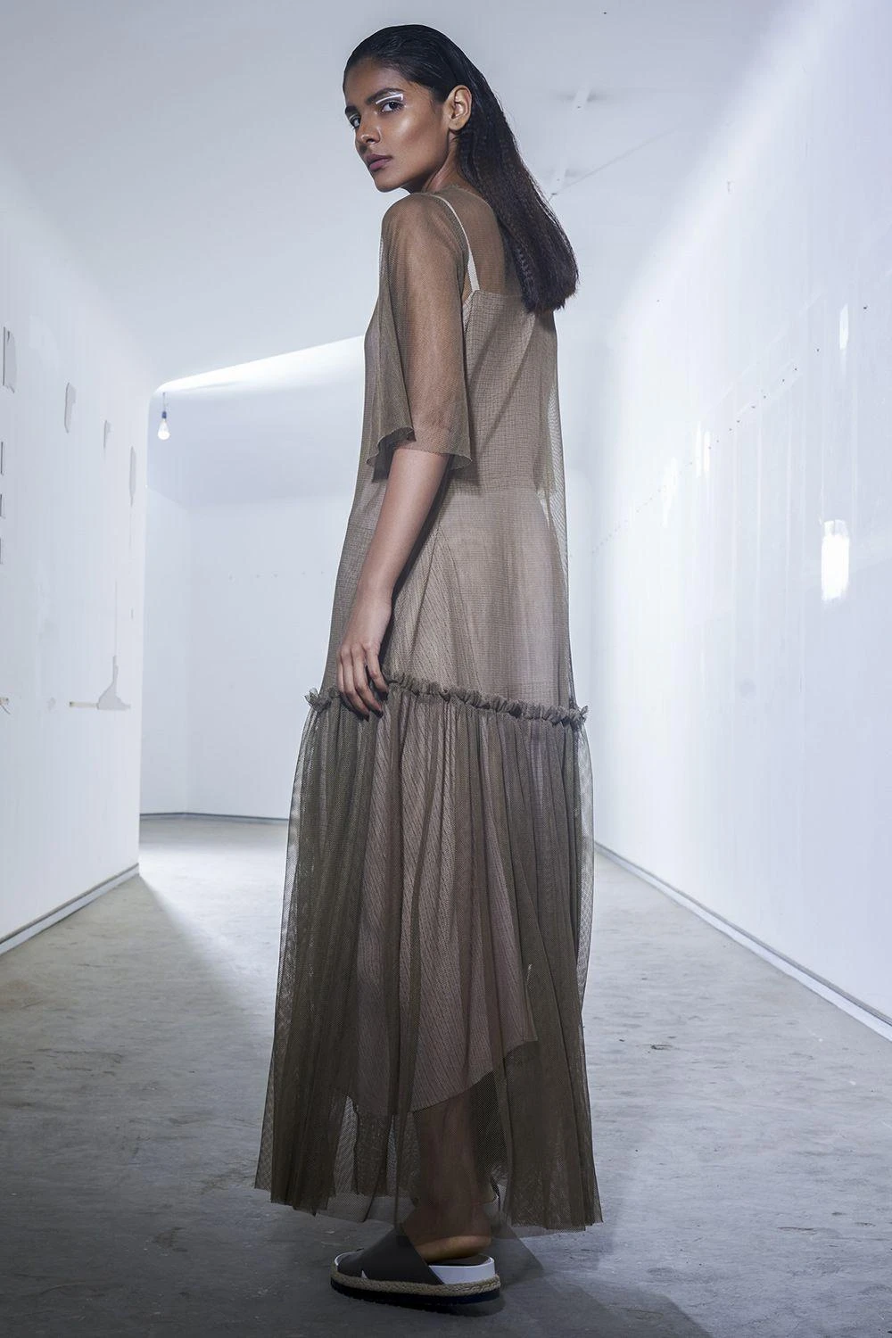 This gossamer olive green dress is our definition of modern contemporary. Look for the playful tiered panel! Can be worn over a slip, a chiffon dress or even on a tee & denim , it will get you a unique look every time.