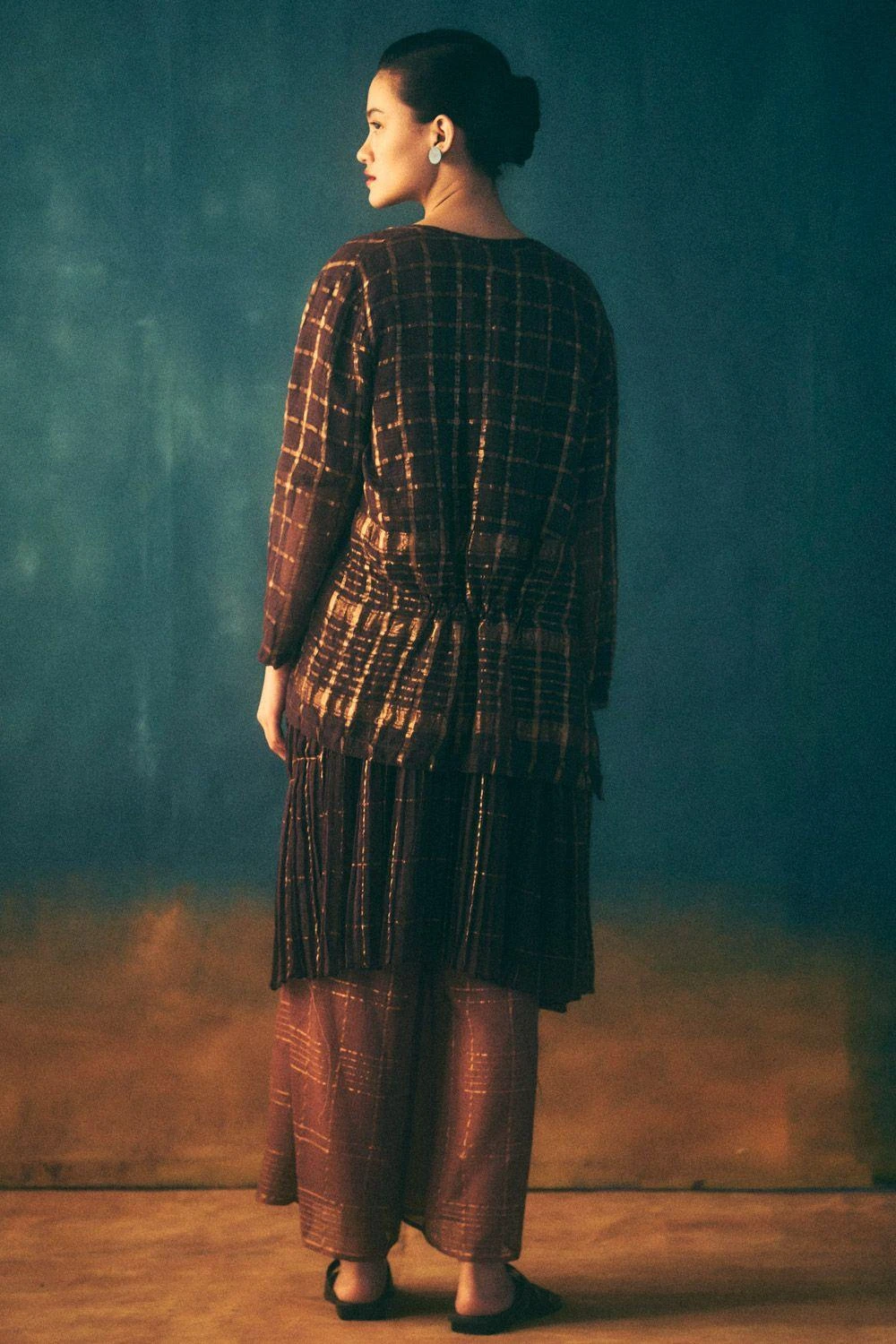 Discover the artistry of this hand micropleated checkered zari kota cotton dress. Kantha stitches delicately hold the pleats, creating a masterpiece of craftsmanship and style.
