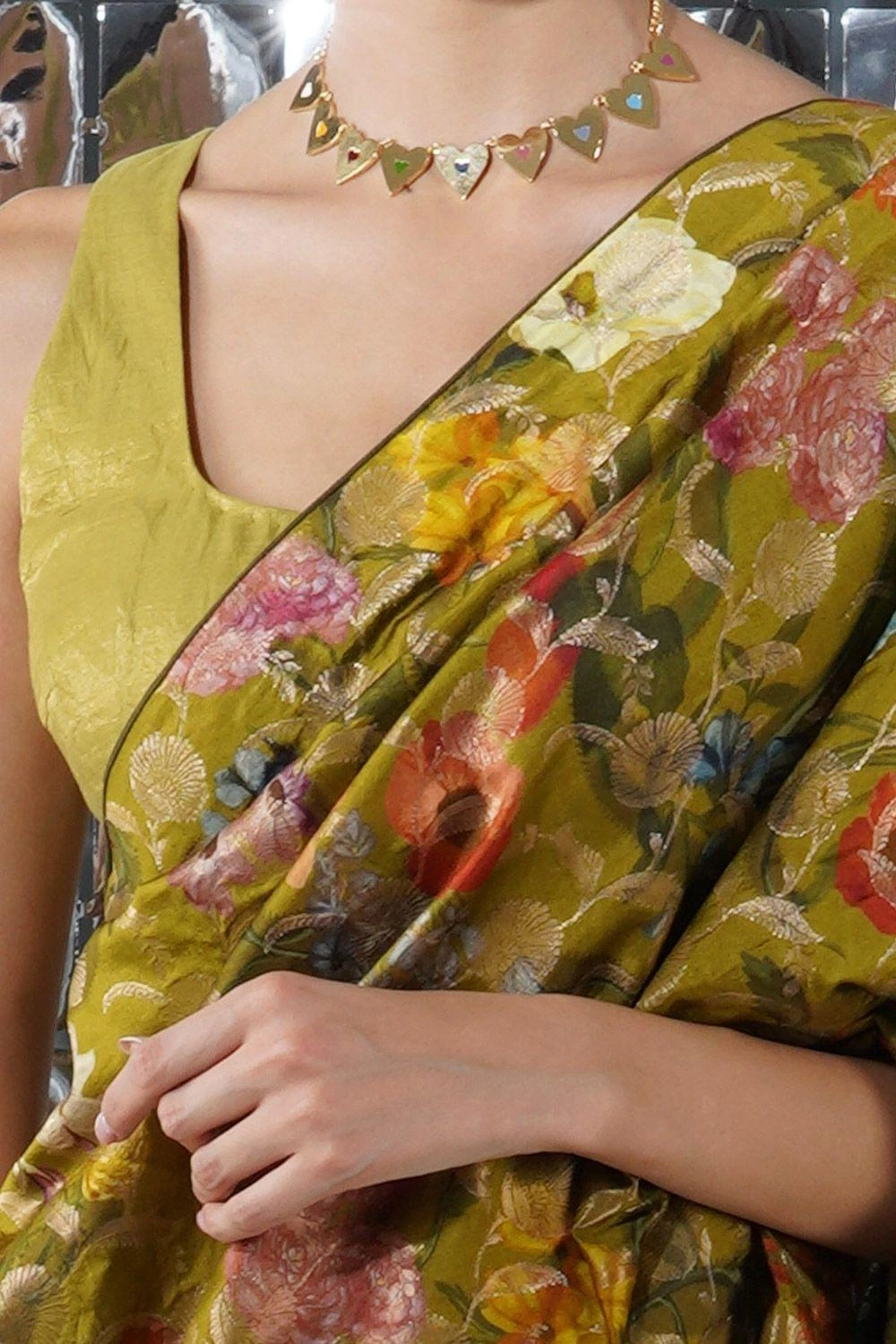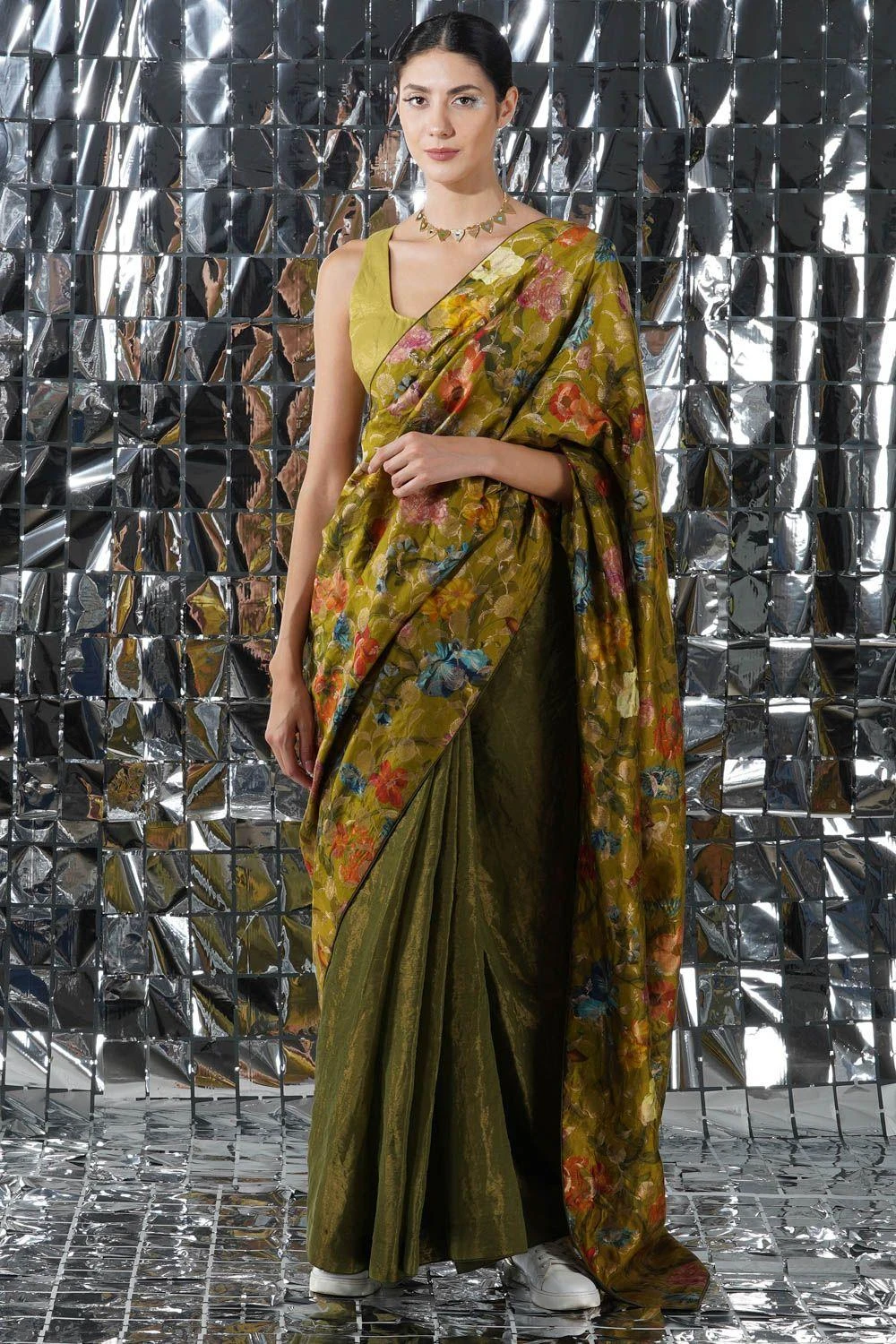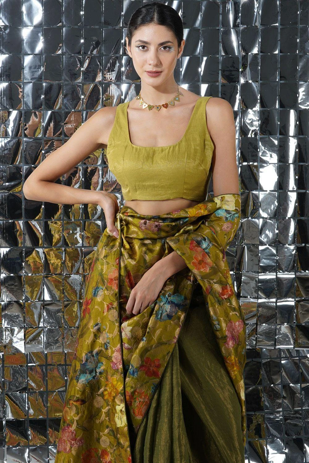 Crafted in gold tissue silk, this green backless blouse features a V-neck. Style this blouse with the aqua blue paradise sari from the collection to complete the set.